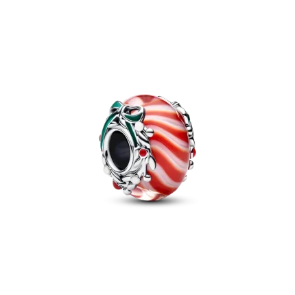 A sweet burst of holiday cheer. This sterling silver charm features vibrant red and white Murano glass shaped like candy.
