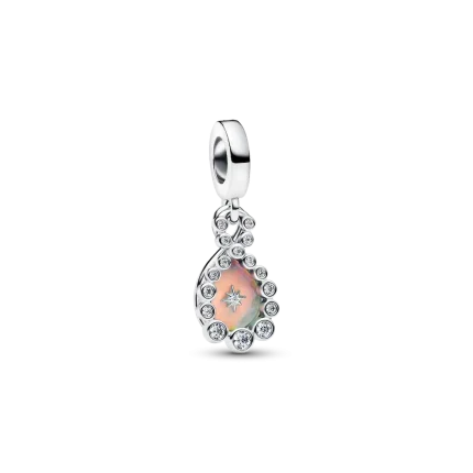 This sterling silver double dangle sparkles with clear cubic zirconia on one charm and aurora lab-grown opal resin on the