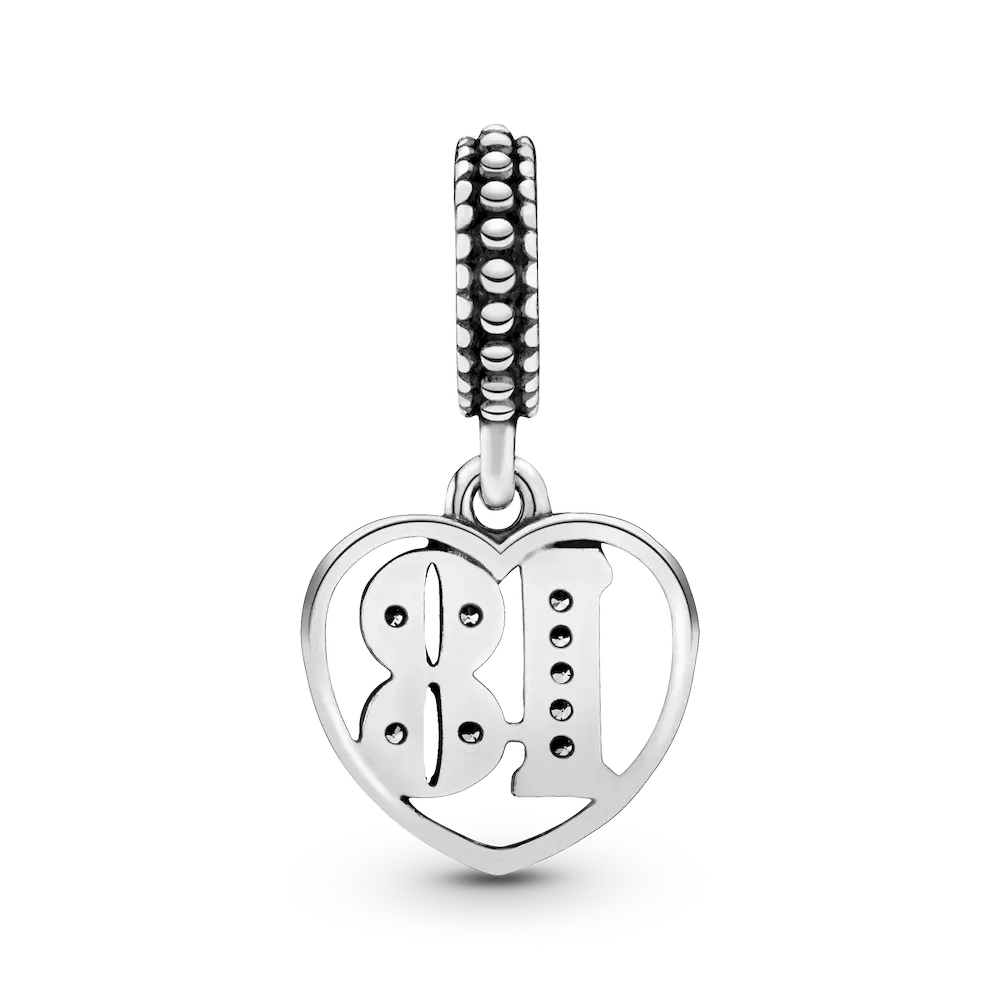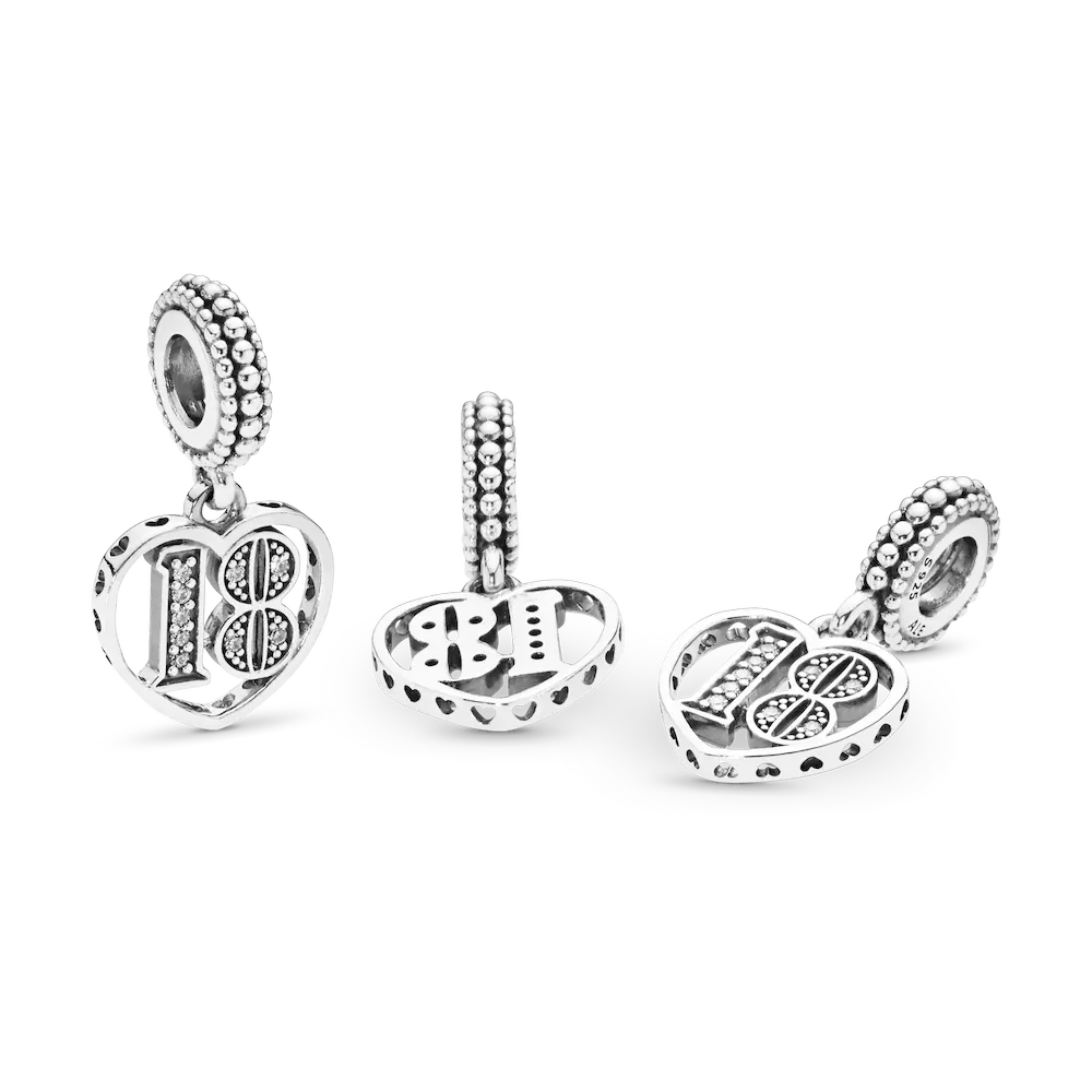 Our coming-of-age style is made to celebrate an 18th birthday. Cast from sterling silver, the beaded bail holds a heart-shaped dangle that is decorated with a stone-embellished number 18, framed with cut-out hearts along the outer edge. The perfect gift to mark the move into adulthood, it looks equally cool worn on a Pandora Moments bracelet or favorite necklace.