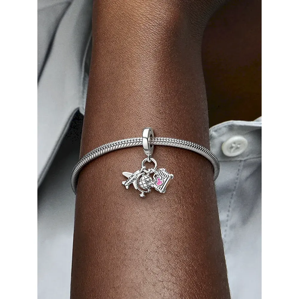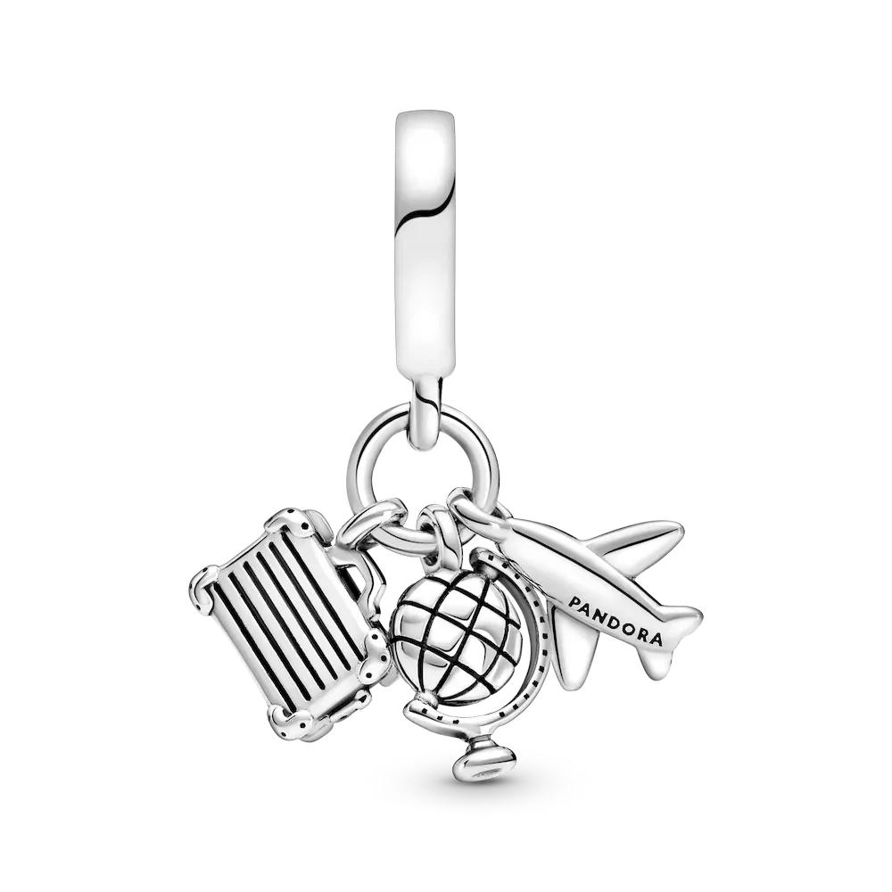 It’s time to pack your bags and add the Airplane, Globe & Suitcase Dangle Charm to your collection. 3 charms in 1, this sterling silver piece is every travel lover’s dream. Details include grooved windows on the airplane, longitude and latitude lines on the globe and a hand-applied pink enamel heart on the suitcase. Add this travel charm to your collection as a promise to plan future adventures or gift it to your globe-trotting BFF.