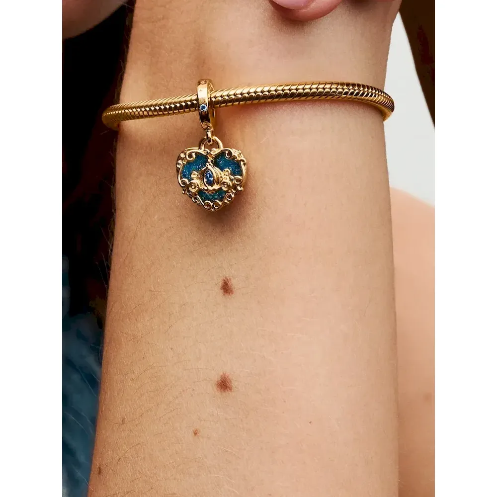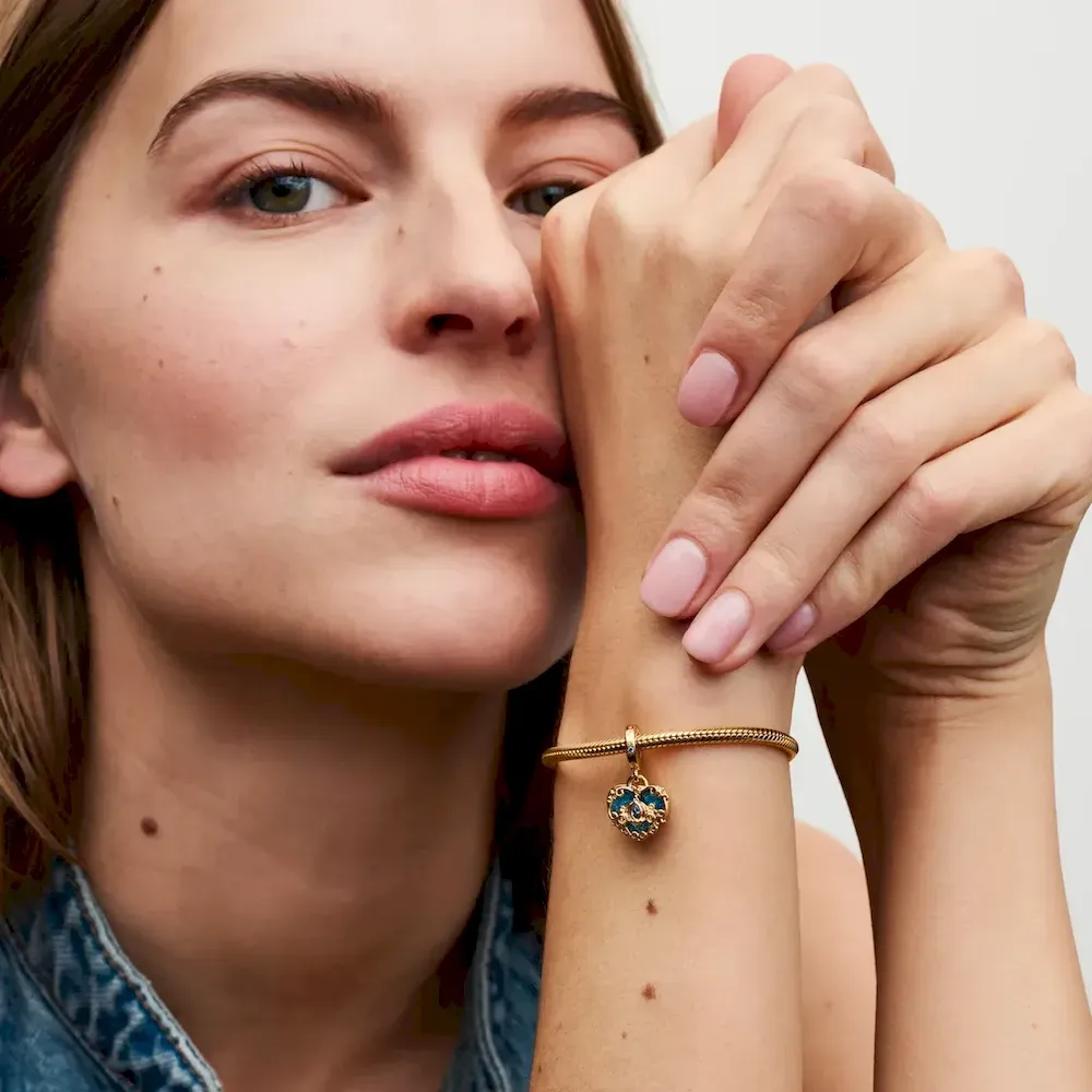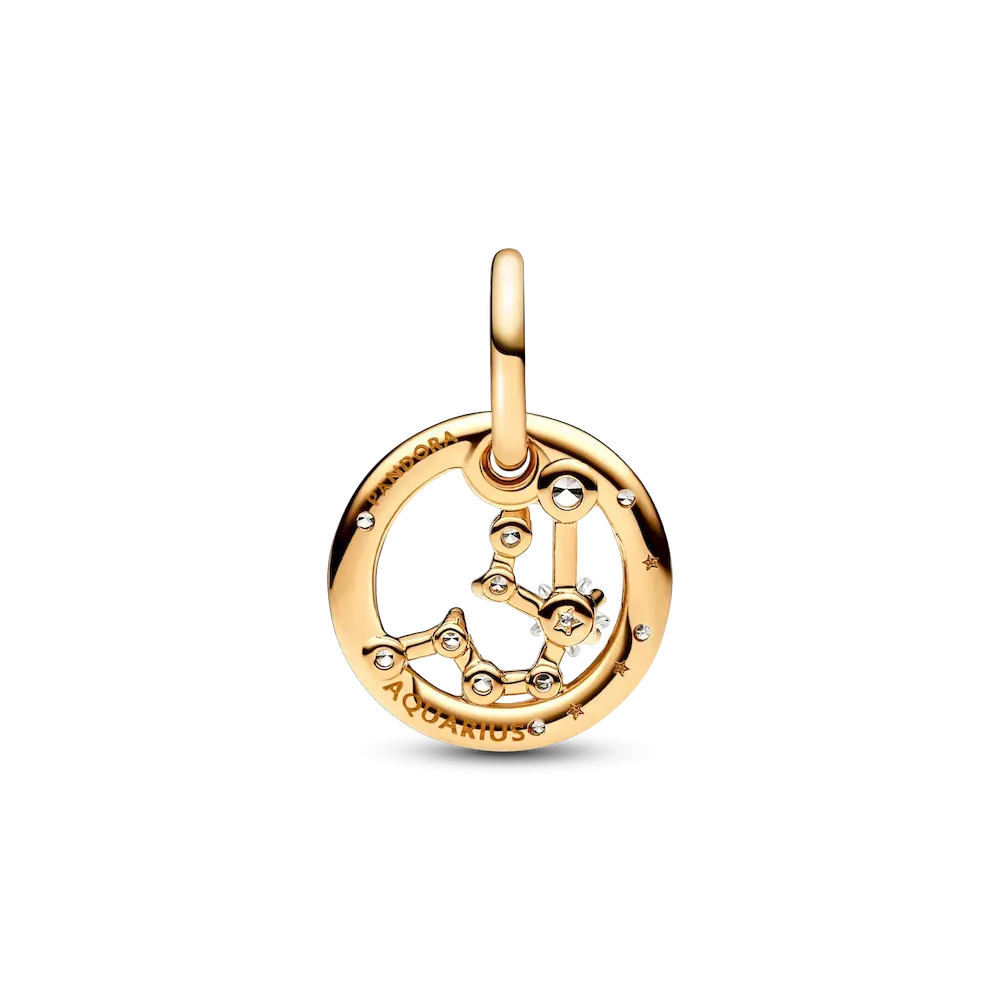 Let the stars guide your look with the Pandora Aquarius Zodiac Dangle Charm Bracelet Set. The dangle is crafted from our 14k gold-plated unique metal blend, has a circular outer frame and features clear sparkling cubic zirconia as well as the shape of the Aquarius zodiac sign. The back side of the frame is engraved with