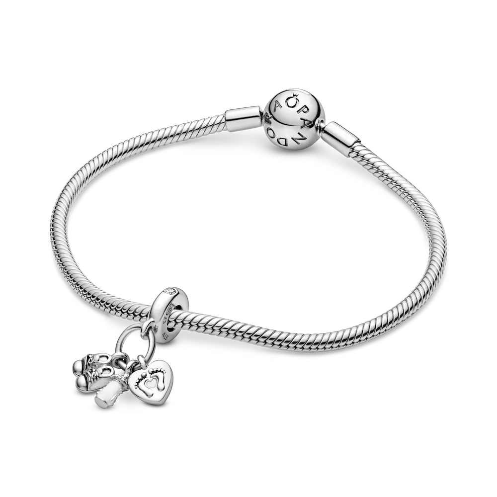 What better way to celebrate a new baby’s arrival than with our beautifully crafted dangle charm in sterling silver? The polished piece holds an adorable trio of baby essentials: a bottle, booties and a heart embossed with footprints. It’s punctuated with sparkling cubic zirconia accents and touches of hand-applied white enamel. Wear it as a reminder of your new arrival or to the new mum in your life.