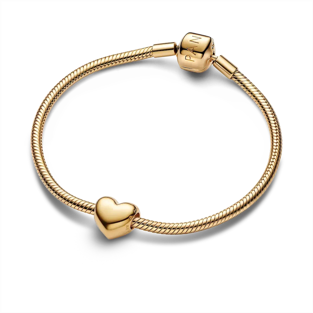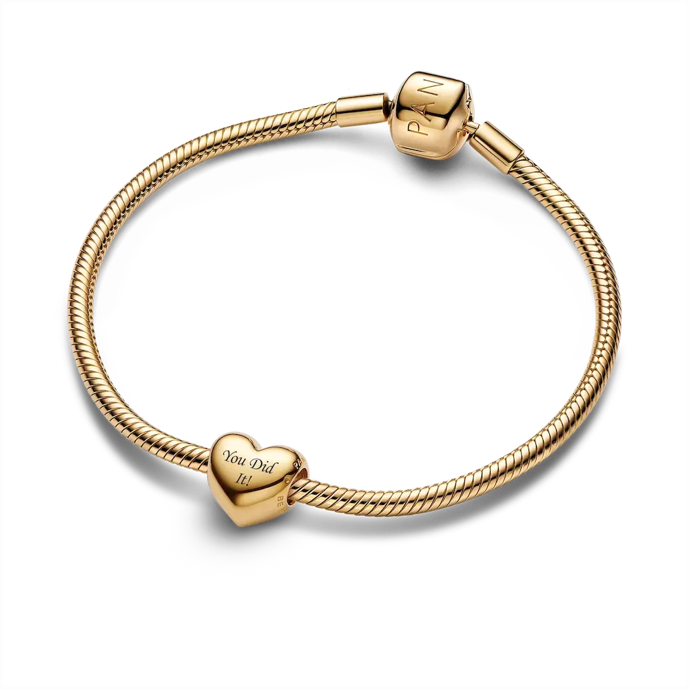 Feel it. Engrave it. Be love. The new heart charm is the perfect canvas to express your love for the people and the things that matter most. Now plated in lustrous 14k gold, our first ever non-flip charm design features “BE LOVE” engraved on one side and comes styled on a sleek, newly re-imagined snake chain bracelet. This iconic set captures your most meaningful moments forever– just add a message written from the heart.