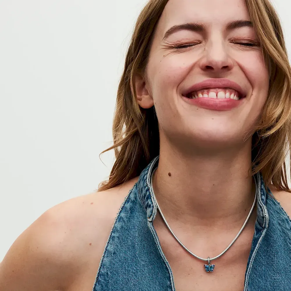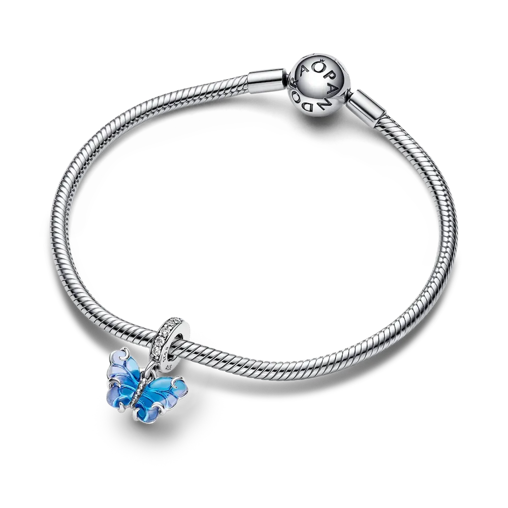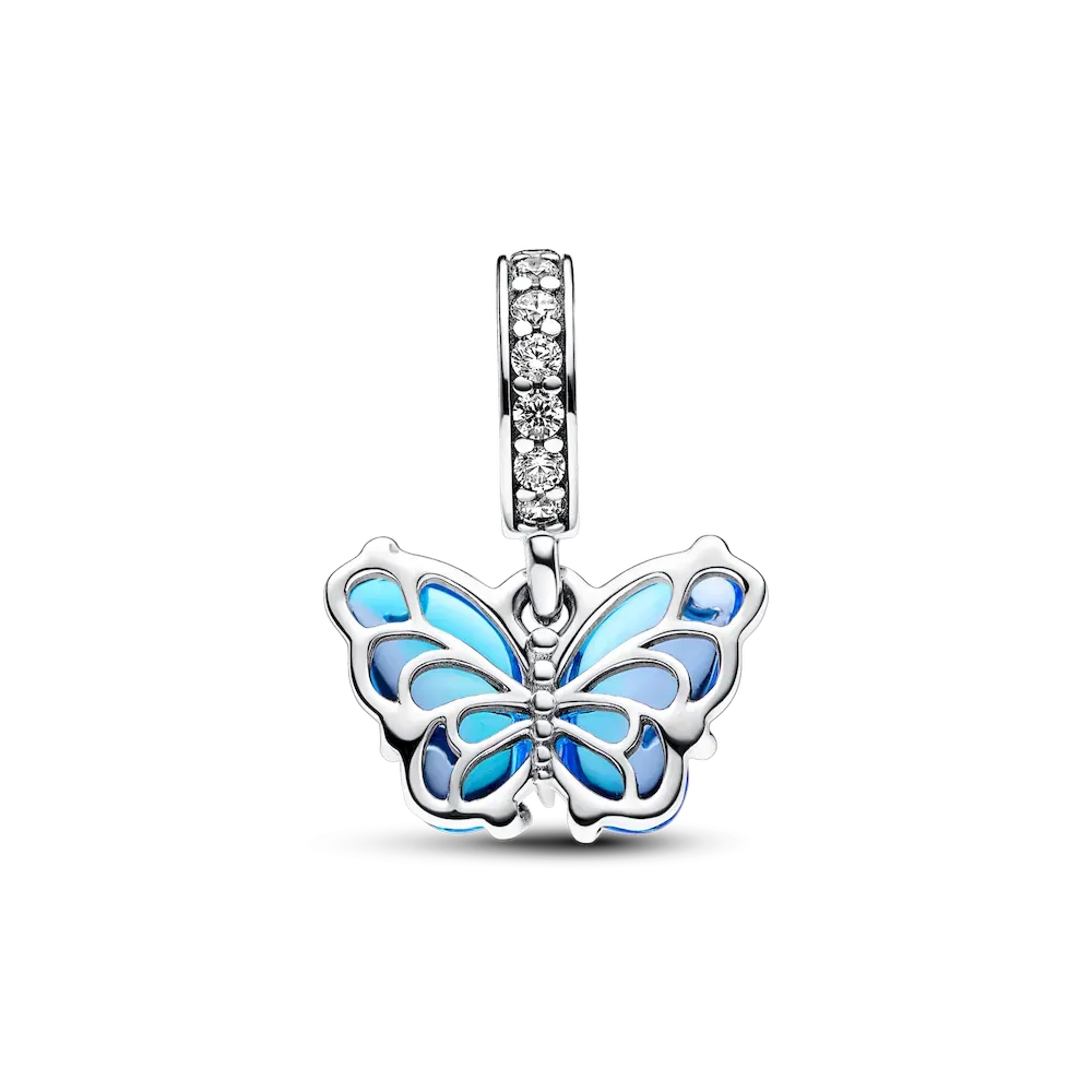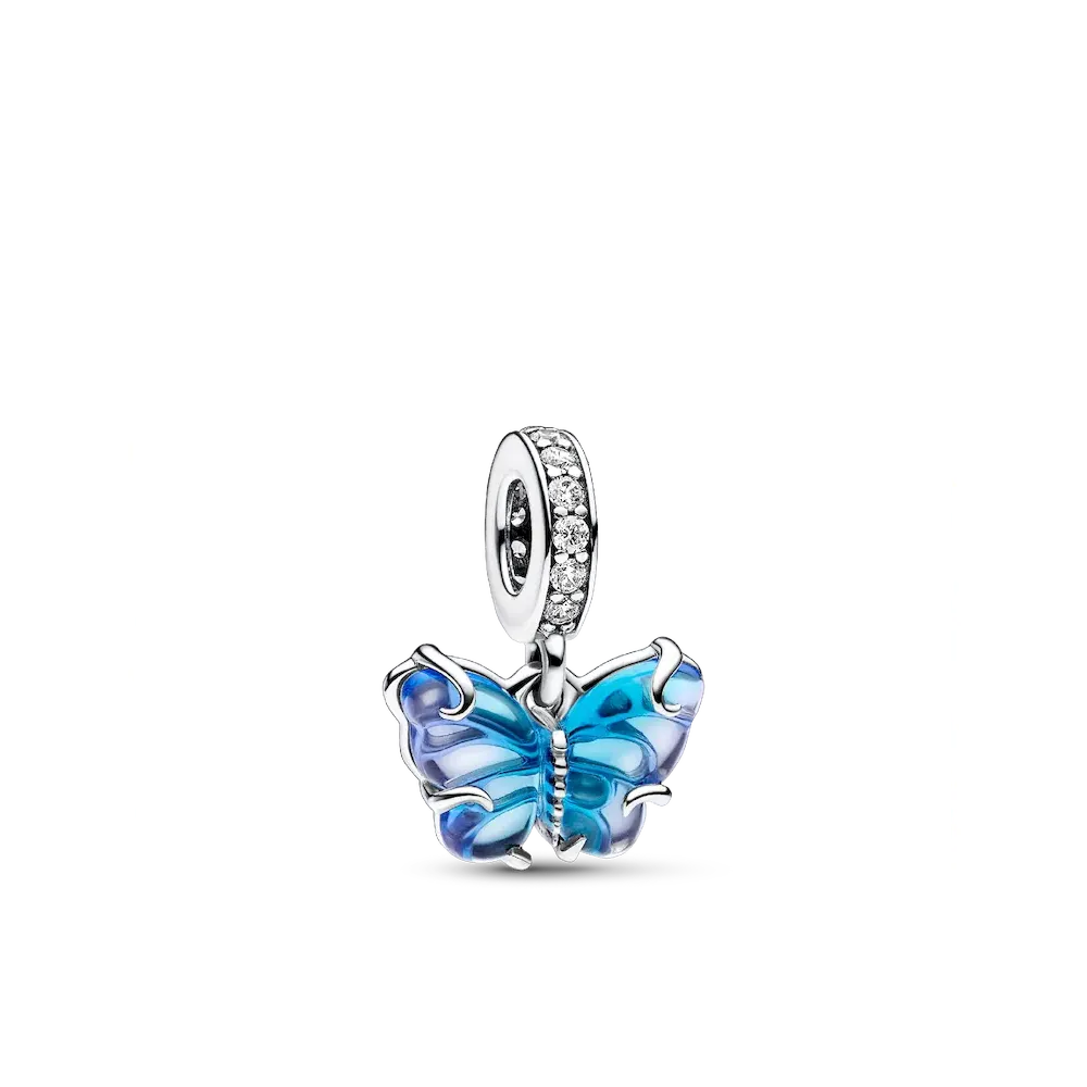 Transform into your best self with the Blue Murano Glass Butterfly Dangle Charm. This hand-finished sterling silver charm features Murano glass wings in a bicolored blue gradient with a cut-out sterling silver pattern on the back that shows through the glass, and sterling silver swirls on the front. Microbeads on the butterfly’s body and pavé on the bail add a touch of delicate detail and sparkle. Add this blue butterfly to your styling as a powerful symbol of hope, transformation and new beginnings.