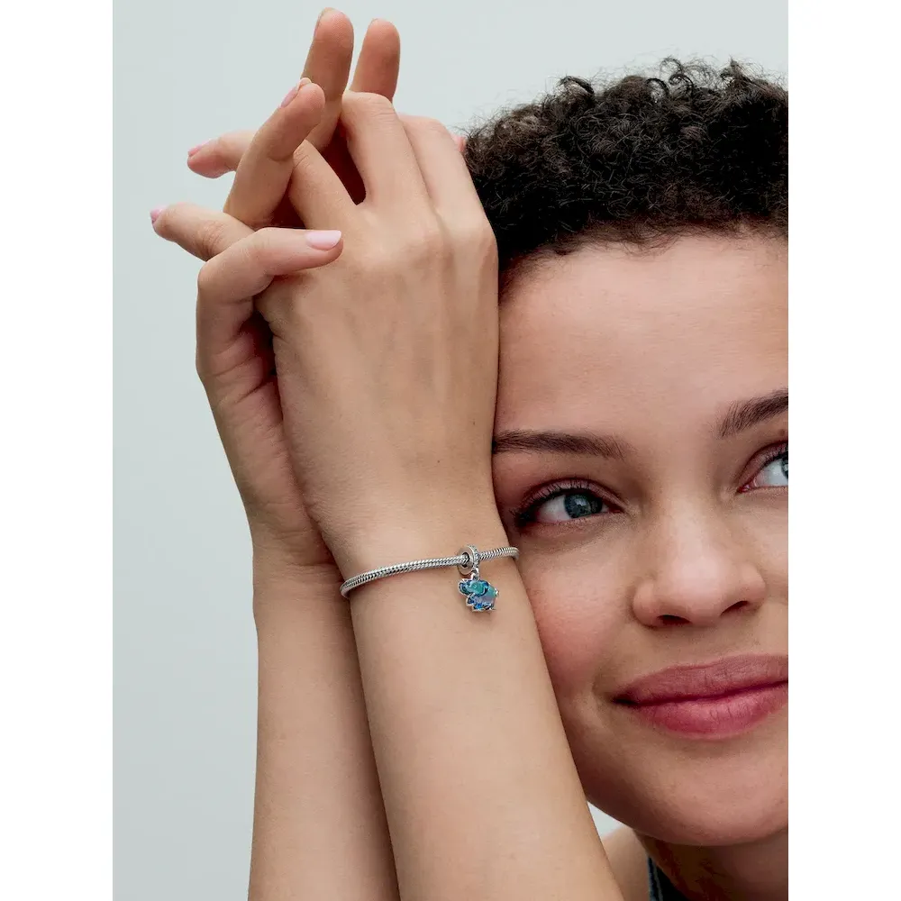 The Blue Murano Glass Elephant Dangle Charm is a colorful ode to a majestic creature. Sterling silver forms an elephant-shaped silhouette around a gradient blue-and-purple Murano glass with a raised ear and a concave rounded eye. Realistic elephant details include an uplifted trunk, feet and a swirling line forming a tail. The bail features a row of pavé and the engraved word