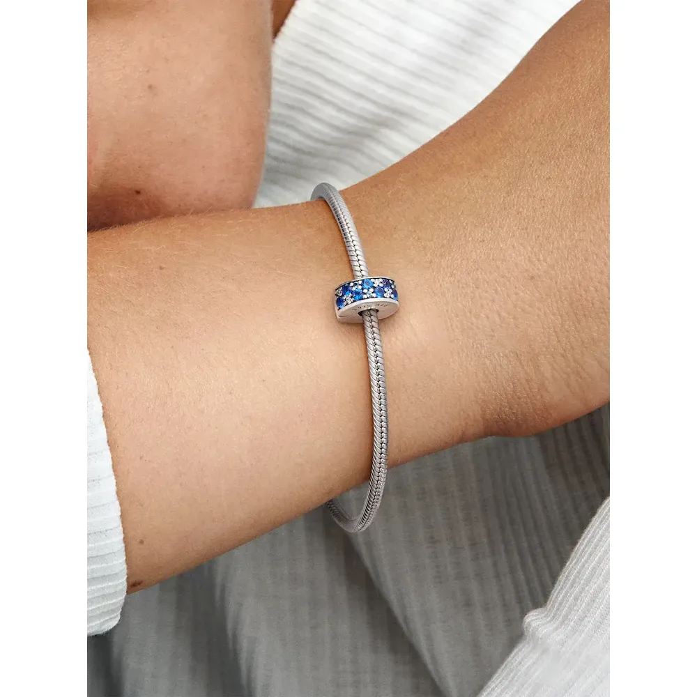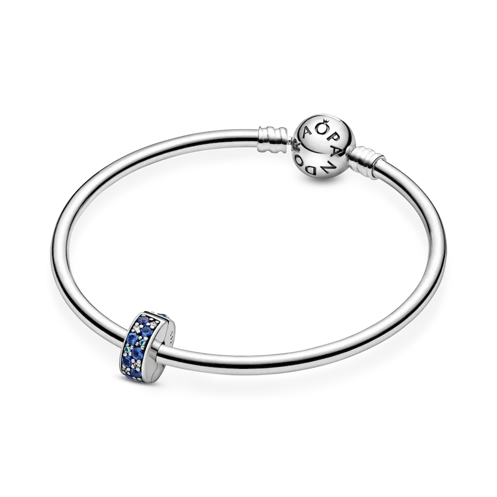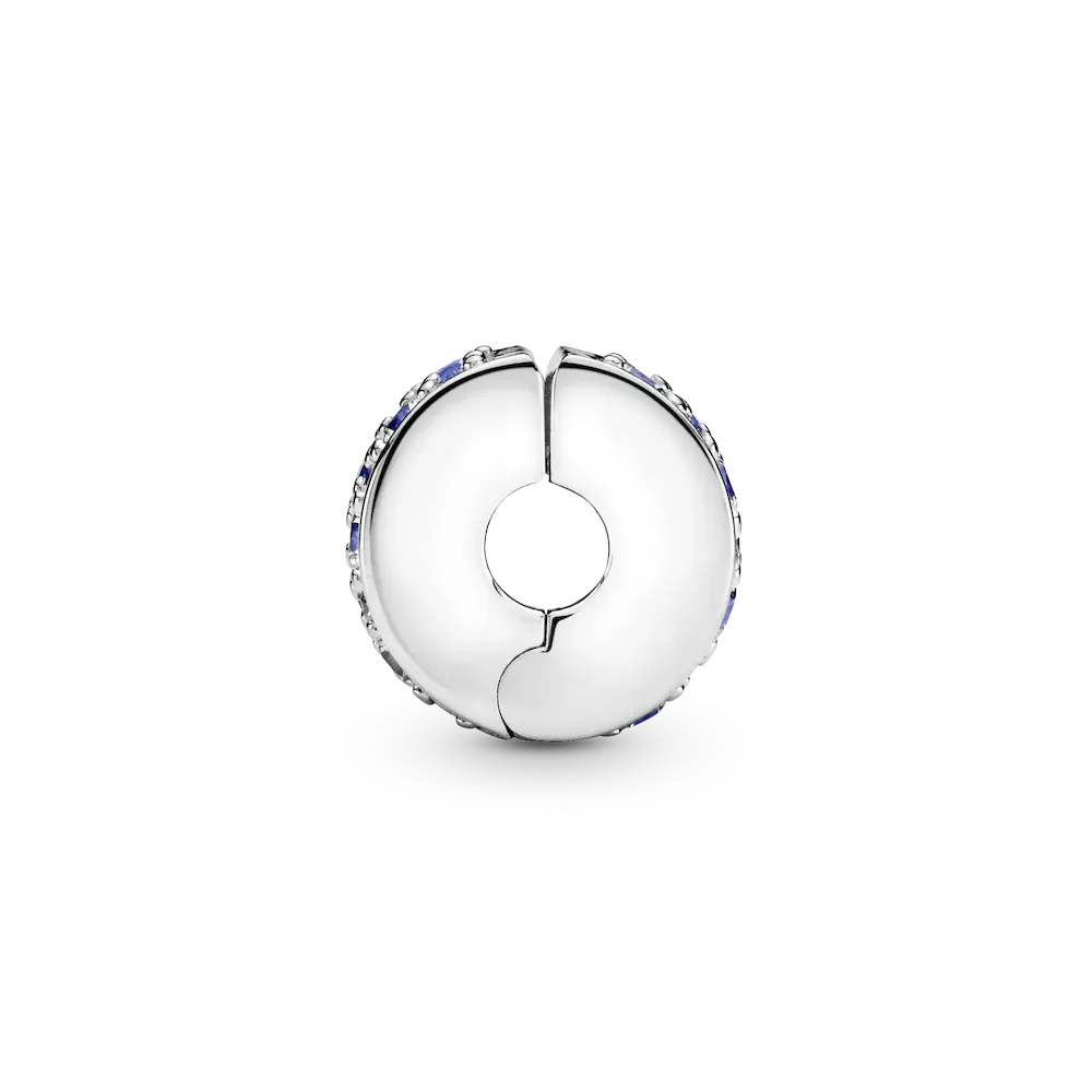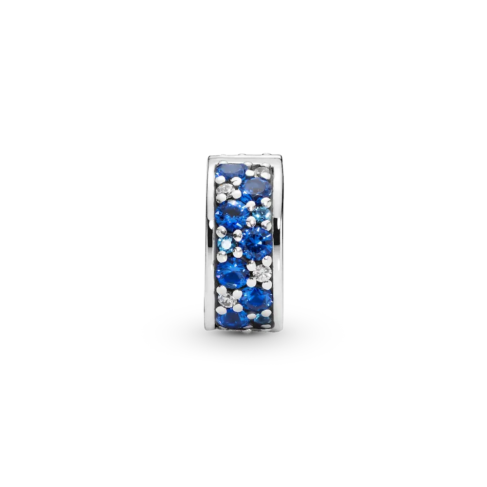 Bring beautiful blue tones to your look with this sterling silver clip charm. Tonal blue crystals and cubic zirconia add a touch of bold color to your charm collection. The hand-finished charm can be styled on your favorite Pandora Moments bracelets and bangles, to create a tonal look or simply add a pop of color. It’s fitted with a hidden silicone grip, so it stays exactly where you want it to when you wear it. This clip charm features a silicone grip, does not fit onto threads (two raised charm dividers.) This charm can be styled anywhere else on the bracelet.