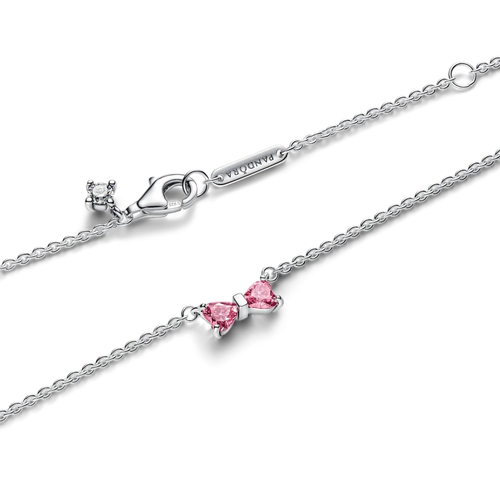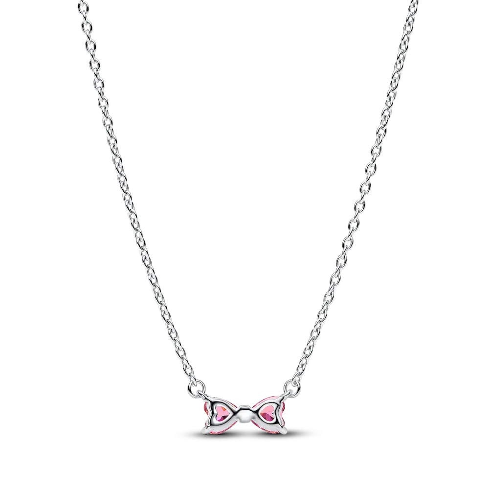 Tied with love. On this sterling silver necklace, two pink heart-shaped stones form a bow that’s fixed to the chain. Adjustable to three different lengths, add it to your stack for a touch of grace and beauty.