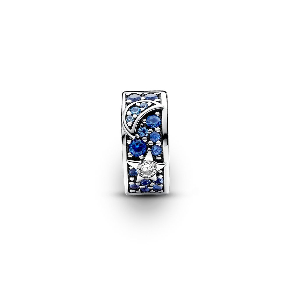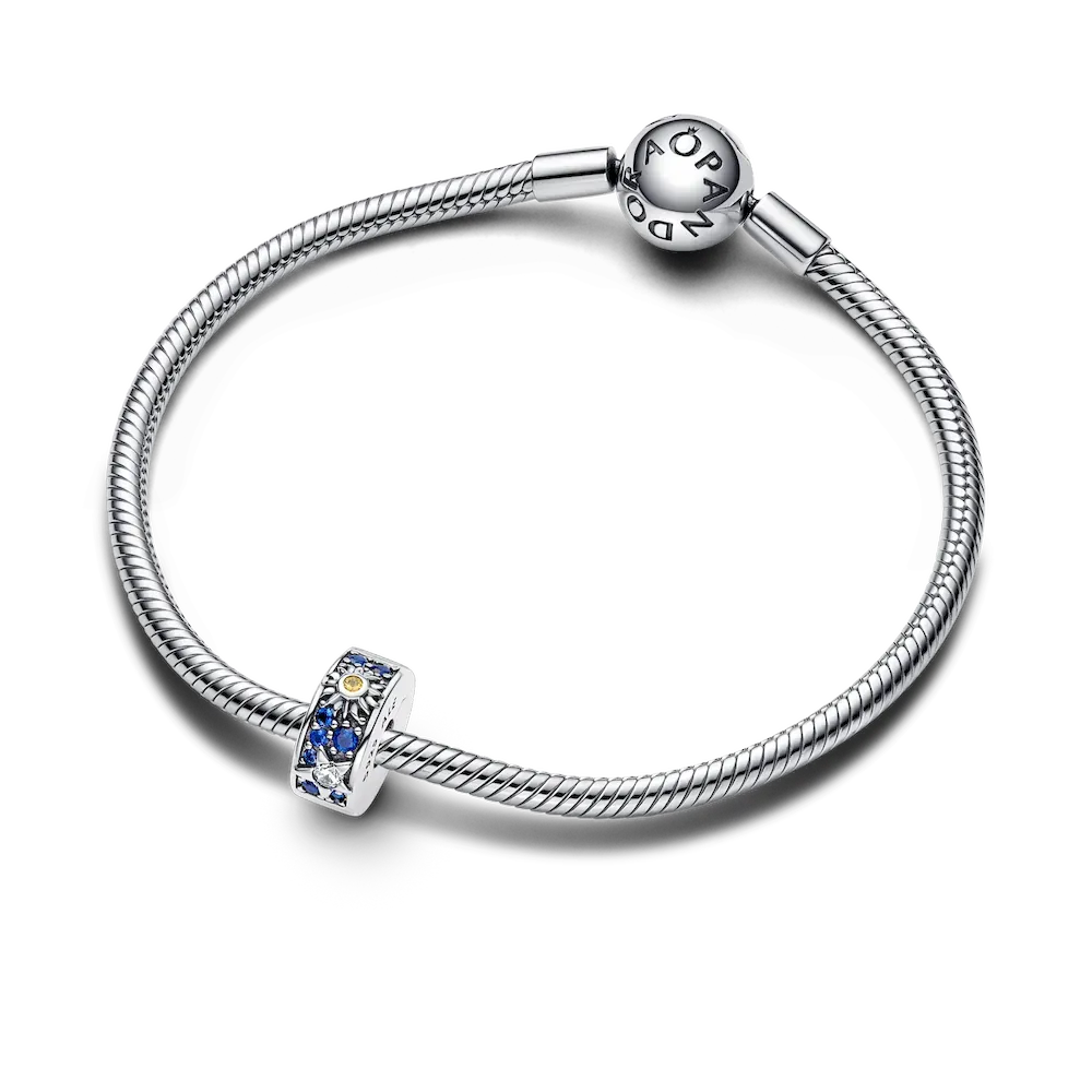 Wear the power of symbols with the Celestial Sun, Star & Moon Clip Charm. This sterling silver clip charm is inspired by the mysterious beauty of the universe, combining sun, moon and star motifs brought to life with sparkling stones in clear, yellow and deep blue tones. It’s lined with silicone so it stays in place on your chain and does not fit over threaders (raised bracelet dividers). The perfect finishing touch to your celestial bracelet styling.