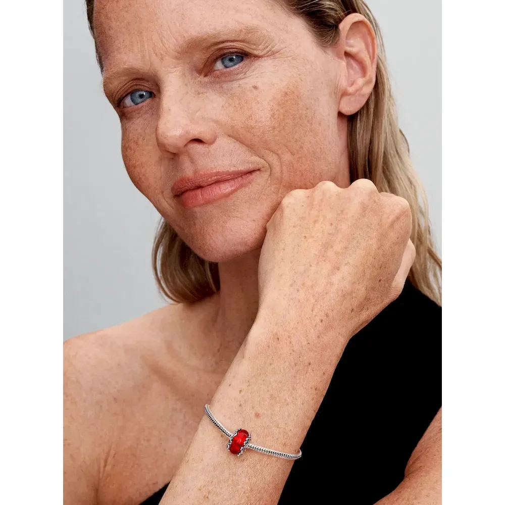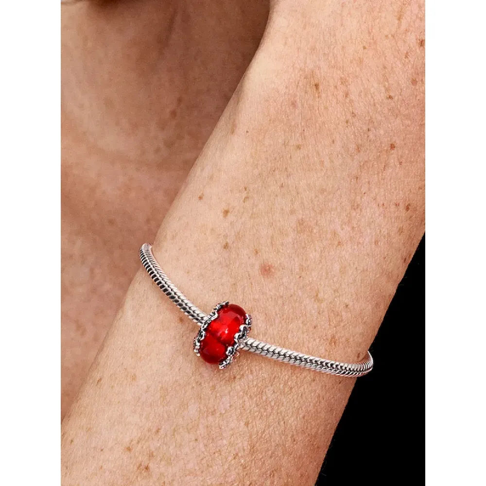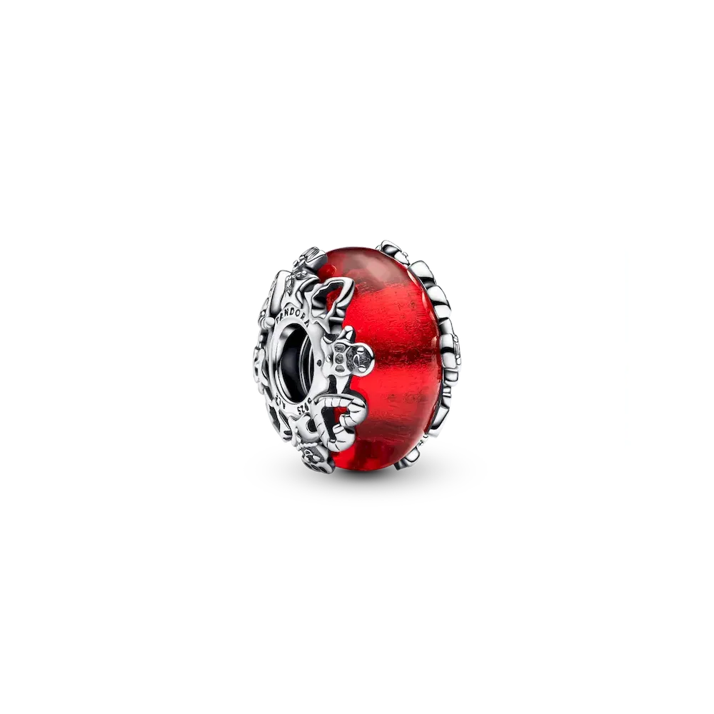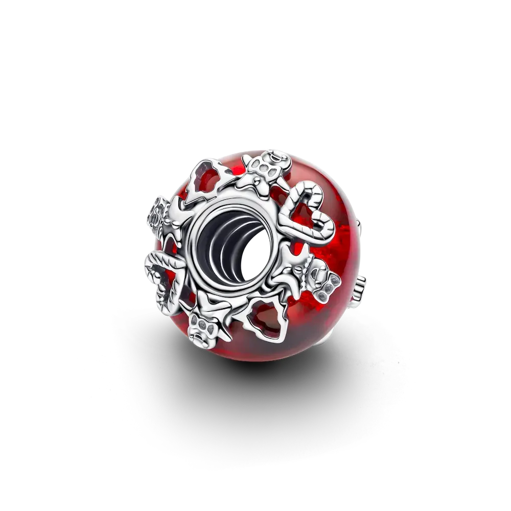 Celebrate the season with our Christmas Magic Murano Glass Charm. The core of our red Murano glass charm is covered in golden foil for a warm inner glow. Christmas trees, gingerbread men and candy cane hearts crafted in sterling silver wrap around the outside of the charm for an extra touch of festive fun.