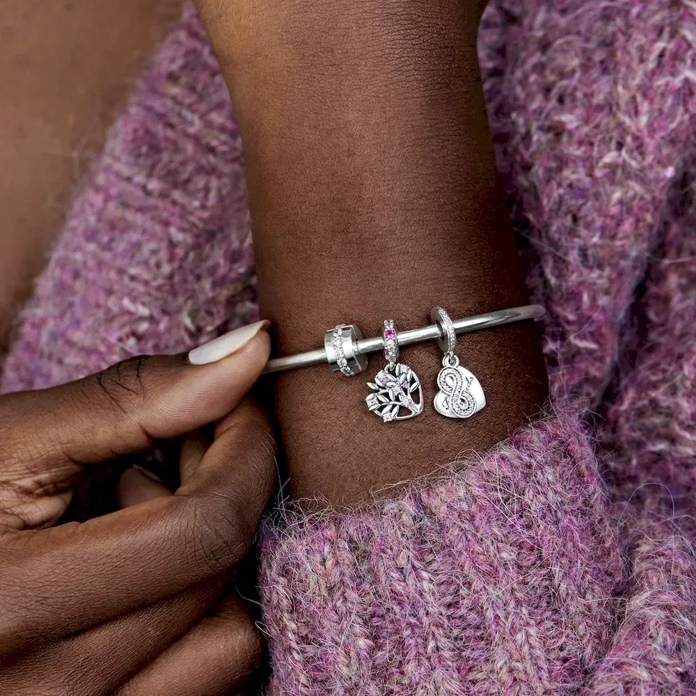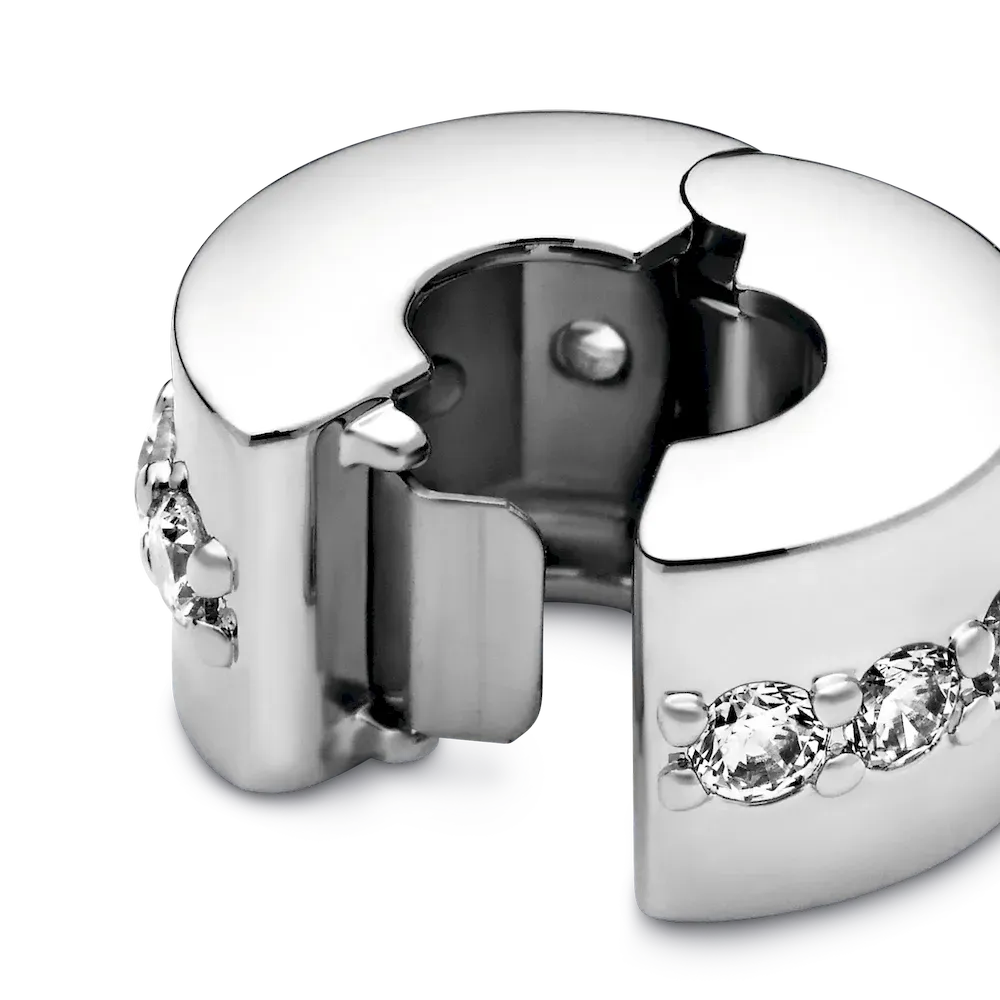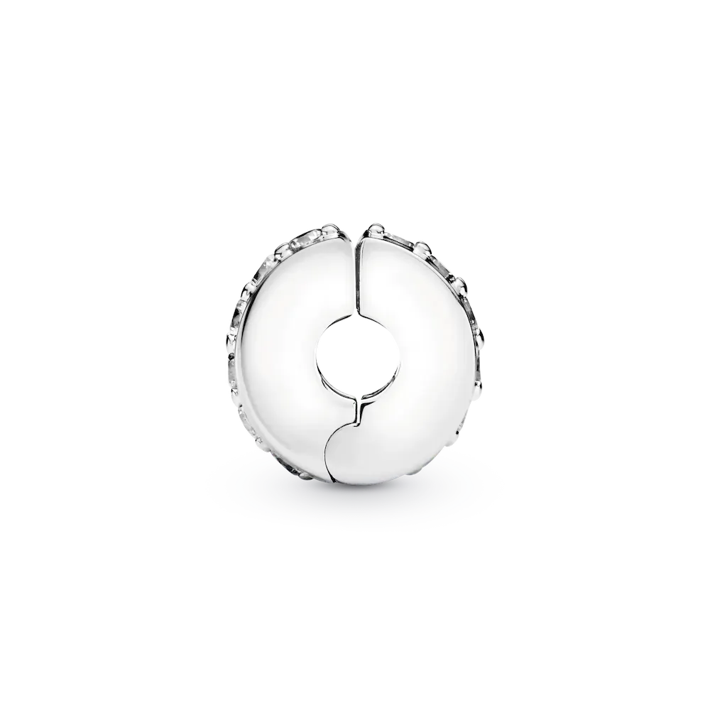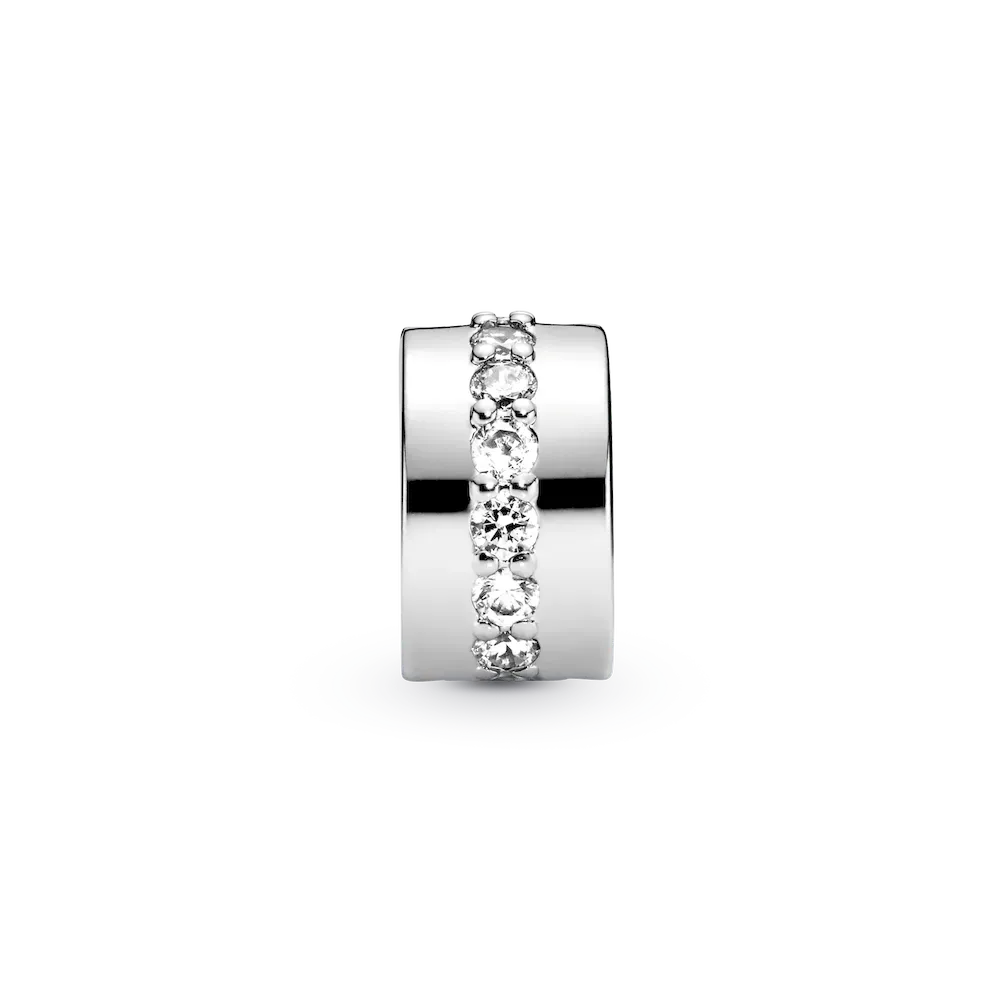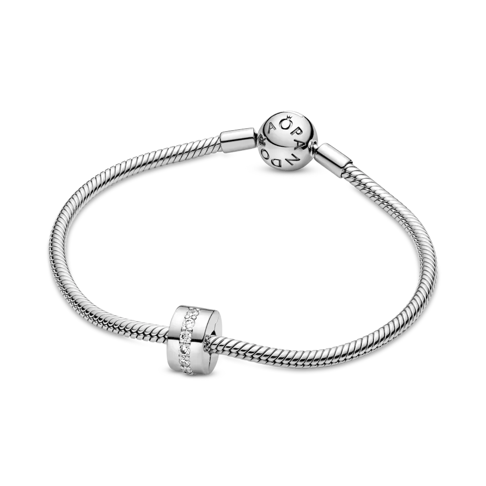 Pandora Moments clip charms help you to evenly space out your charms, bringing both balance and beauty to bracelets. This one is made from sterling silver, accented with a line of cubic zirconia that runs around its middle. Add a single piece to a styling or add one to each end of your bracelet as subtle accents. This clip charm features no silicone grip, so it will slide if not styled onto threads (two raised charm dividers).