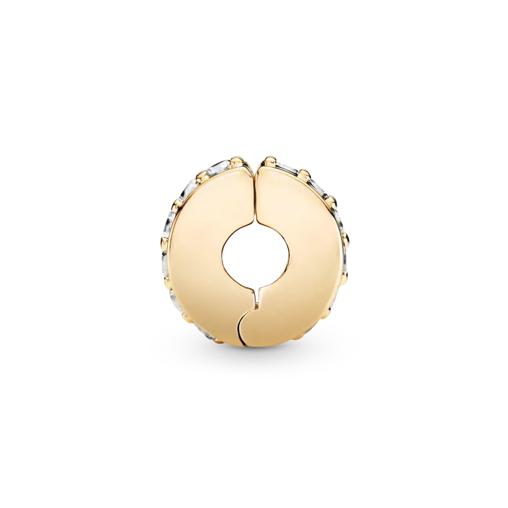 Add a touch of sparkle to your look with the Clear Sparkling Row Clip Charm. Hand-finished in 14k gold, this design features a line of clear cubic zirconia that runs around its middle. Wear this clip charm on your favorite bracelet on its own to make a statement. Alternatively, offset the warm tone of this piece by teaming it with shimmering sterling silver designs for an eye-catching, contrasting finish. This clip charm features no silicone grip, so it will slide if not styled onto threads (two raised charm dividers).