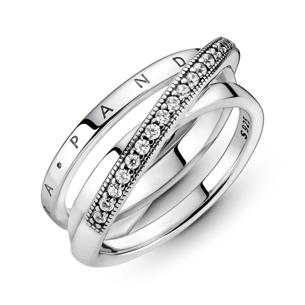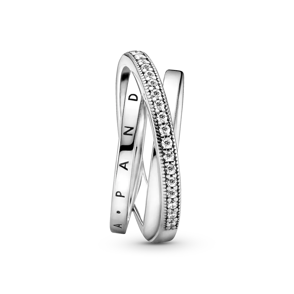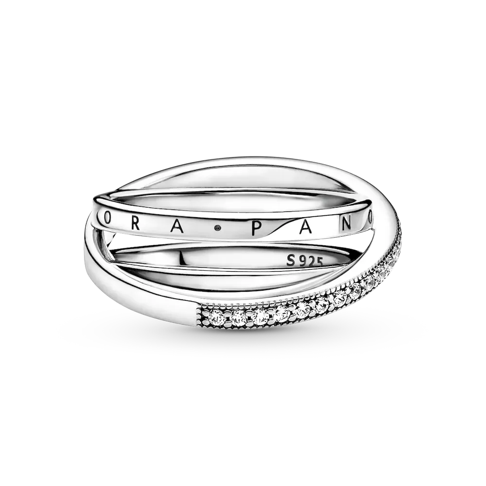 Go for linear layers with the Crossover Pavé Triple Band Ring. This Sterling Silver ring features three bands, with one diagonally overlapping the other two. One inner band has the Pandora logo, the other inner band is polished and the outer band features clear cubic zirconia pavé framed by micro-beading. All three bands merge at the back of the ring shank. Inspired by the spiral structure of the solar system, this ring brings a sleek, structural sophistication to any look.