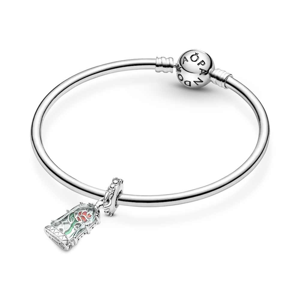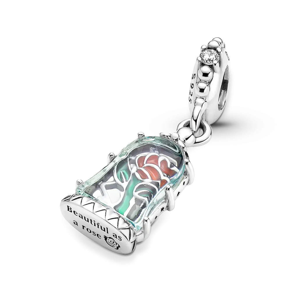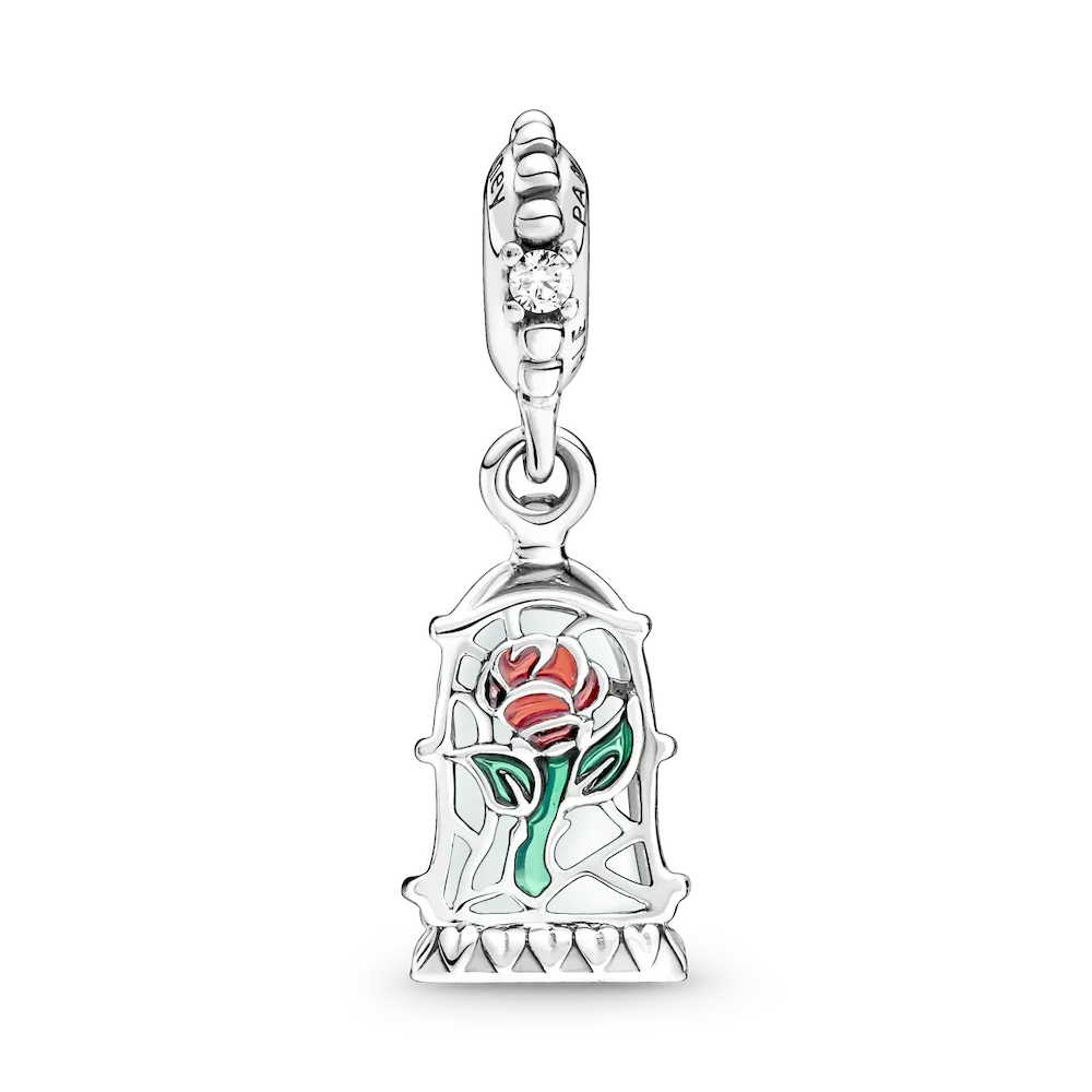 Add a magical touch to your style with the Disney Beauty and the Beast Enchanted Rose Dangle Charm. It features a transparent light blue Murano glass dome with engraved stars encasing a cut-out rose with red and green hand-applied enamel details. Hand-finished in sterling silver, the charm is decorated with clear cubic zirconia stones and micro-beads on the bail and features the engraving