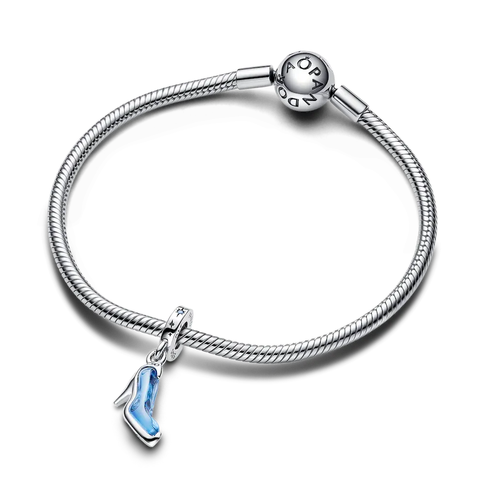 Have your own glass slipper moment with the Disney Cinderella’s Glass Slipper Dangle Charm. Cinderella’s famous glass slipper is reimagined as a sterling silver charm with dreamy light blue man-made crystal. The bail and sole of the shoe are adorned with star shapes, and two blue cubic zirconia stones add sparkle to the bail. Wear it as a reminder that you already have everything you need within for a happily ever after – the YOU edition.