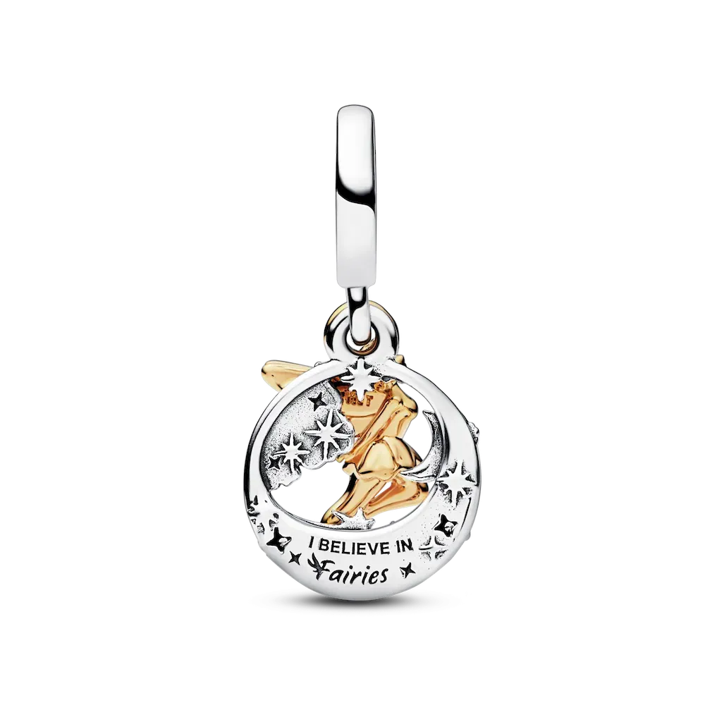 The next best thing to pixie dust, add our Disney Tinker Bell Celestial Night Dangle Charm to your collection for a touch of everyday magic. This two-tone charm is hand-finished in sterling silver and 14k gold plating and features Tinker Bell in her classic flying pose. Two brilliant-cut clear cubic zirconia mimic the light in the evening sky as she soars off to new adventures.