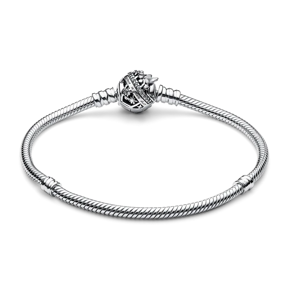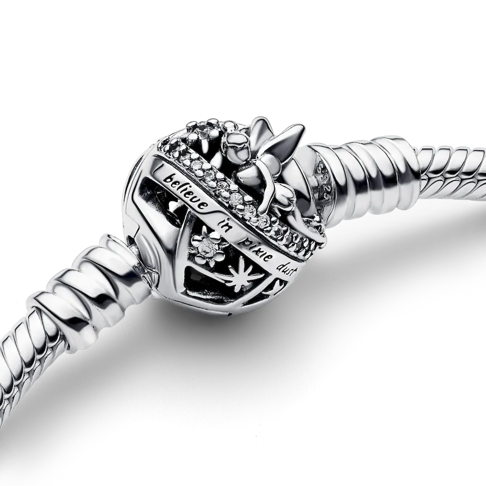 Make every day magical with our Disney Tinker Bell Clasp Moments Snake Chain Bracelet. The round openwork clasp features Tinker Bell holding a sparkling pavé ribbon, as well as the engraved message