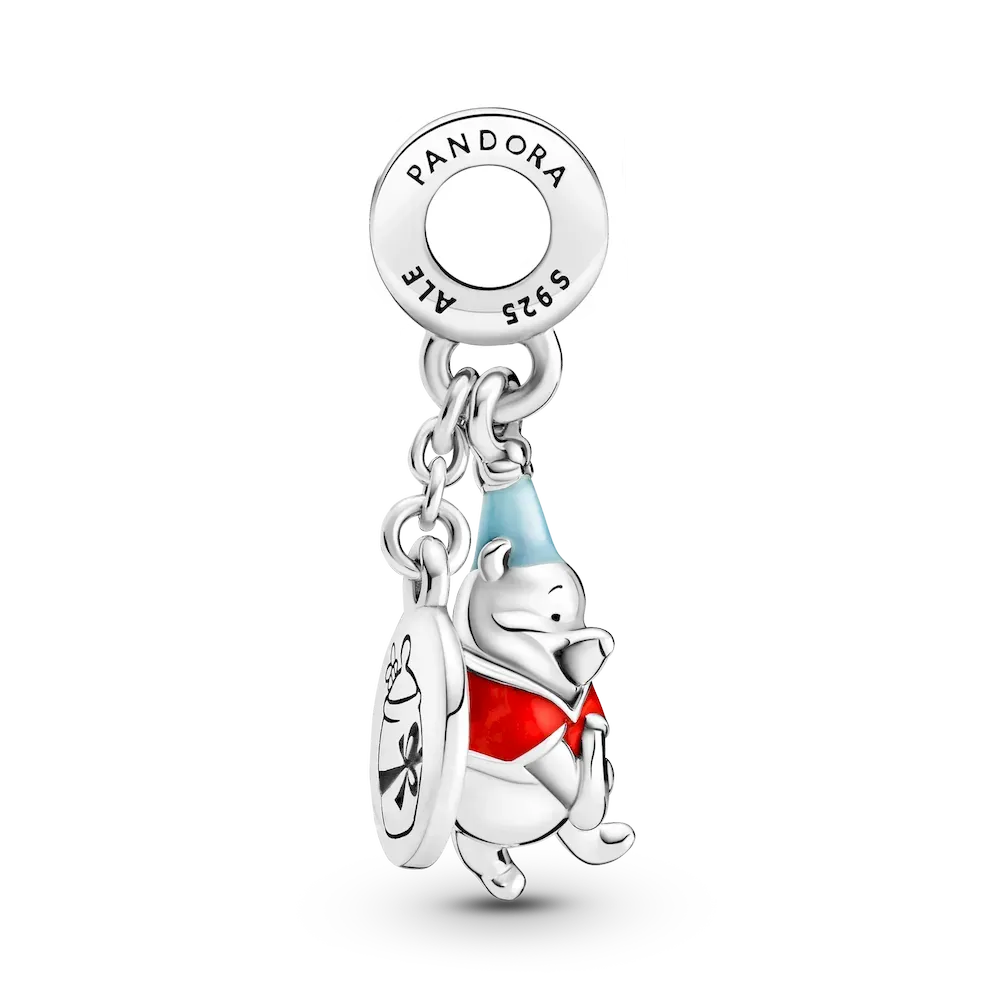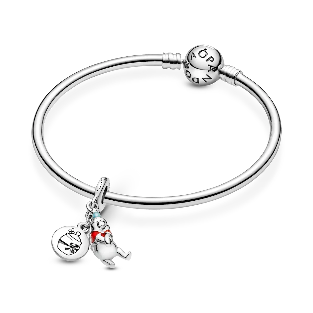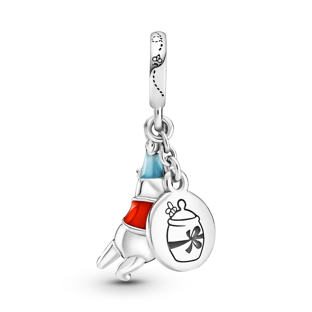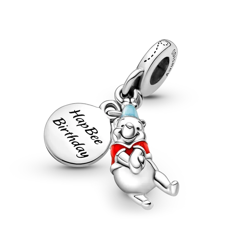 Make their special day one to remember with the Disney Winnie the Pooh Birthday Dangle Charm. Hand-finished in sterling silver, the front dangle includes a 3D version of Disney’s Winnie the Pooh wearing a hat and shirt decorated with hand-applied blue and red enamel. The back disc features the engraving “HapBee Birthday” with a honey pot on the other side. A small bee detail decorates the bail. Gift this piece to your loved one as they celebrate another year.