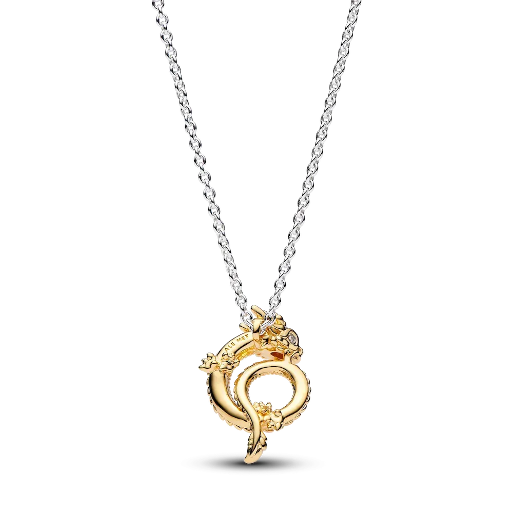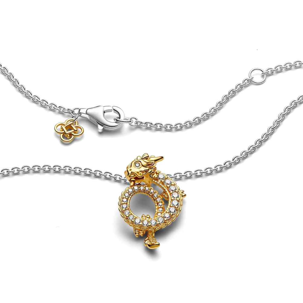 Invite good fortune in the coming year with the Two-tone Dragon Collier Necklace. 2024 is the Year of the Dragon – the 5th animal in the Chinese zodiac, this mythical creature represents good fortune, strength, power, wisdom and health. This sterling silver necklace features a curled dragon pendant in 14k gold plating with intricate details and a row of sparkling pavé along the dragon’s body. The pendant is not detachable and slides freely along the sterling silver chain, which is adjustable in length. A 14k gold-plated peace knot dangles near the clasp. Wear this necklace to invite the qualities of the dragon into your year ahead, or gift it to a loved one who was born in the Year of the Dragon.
