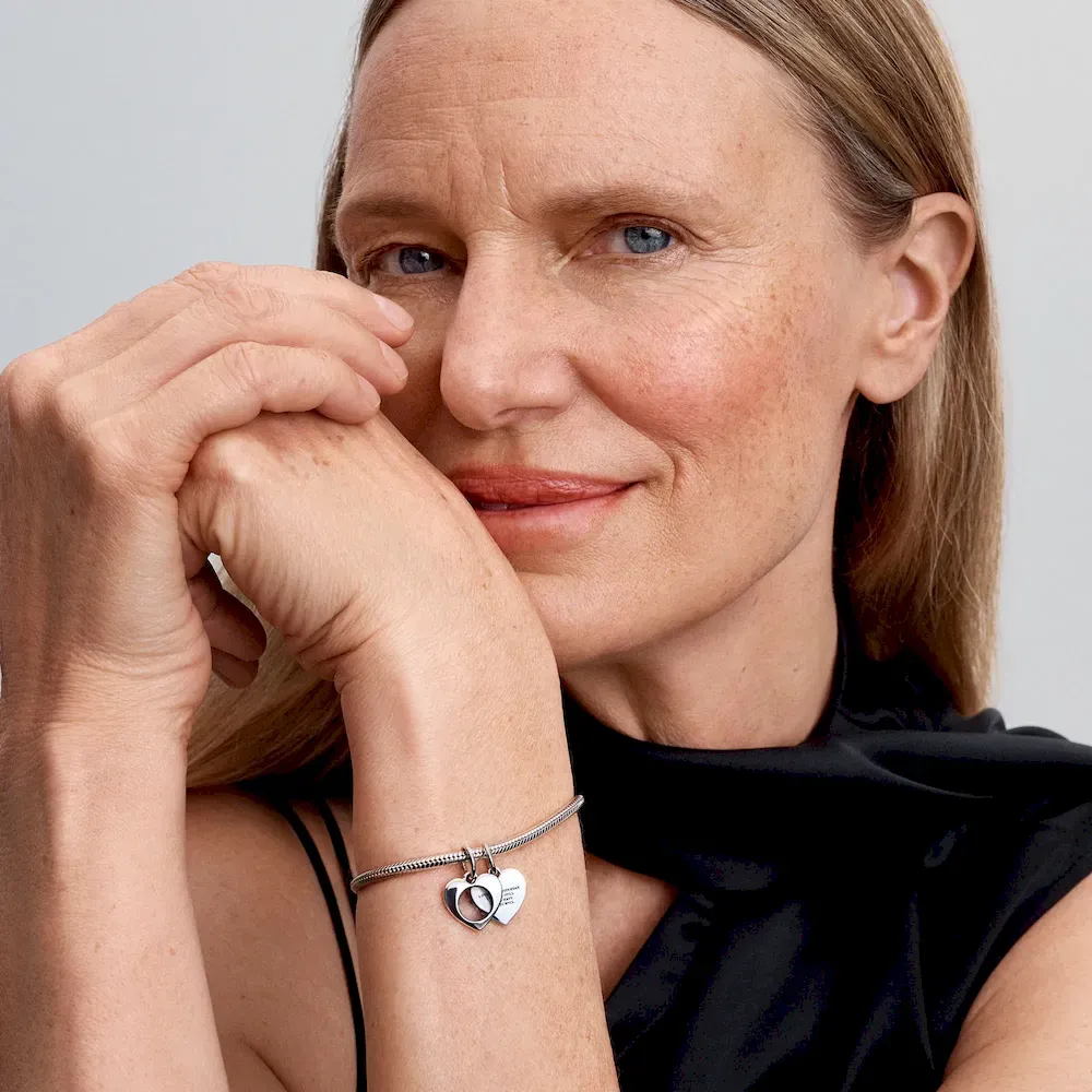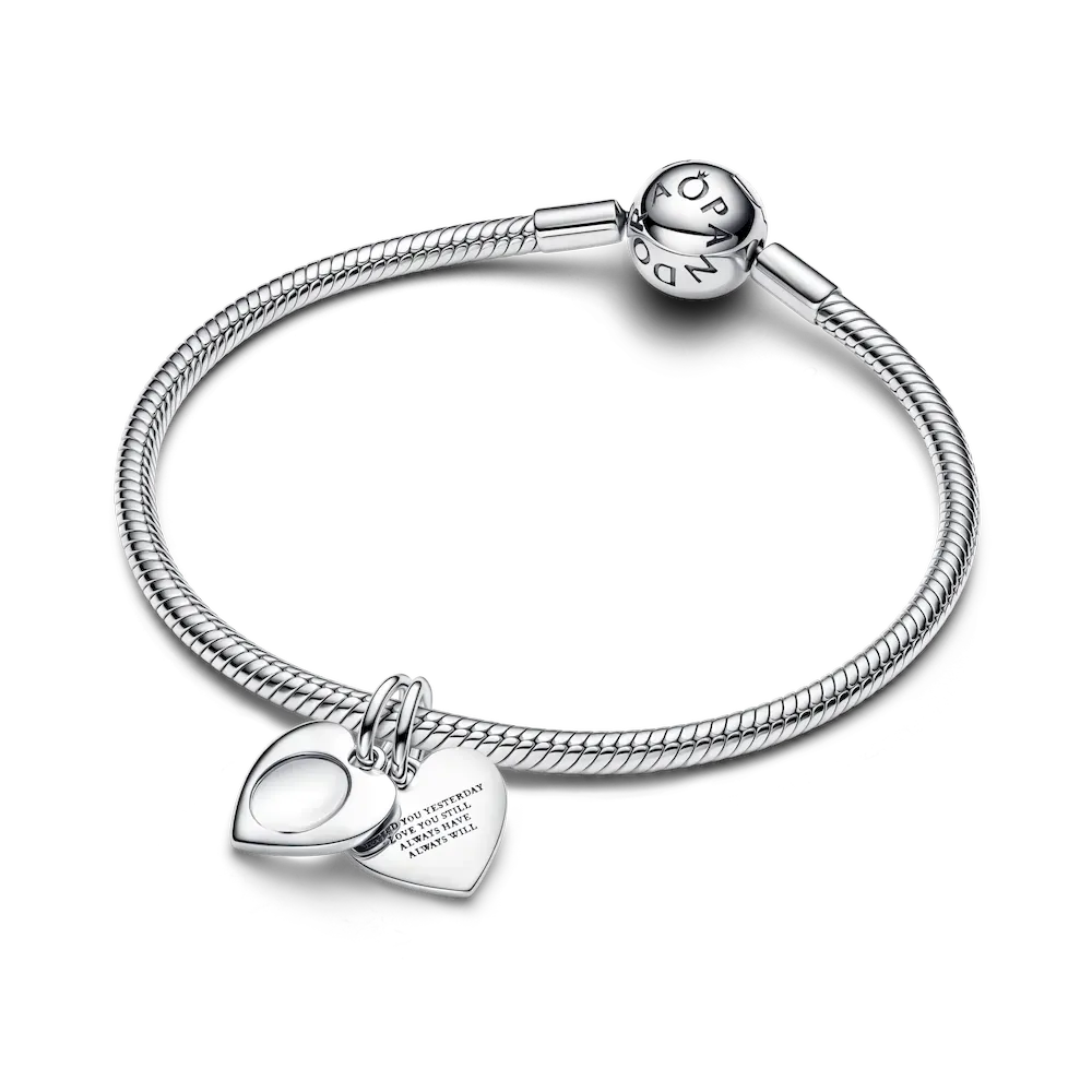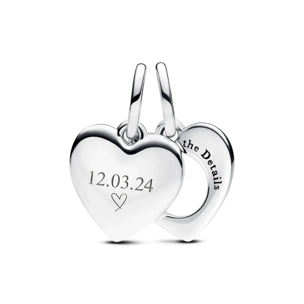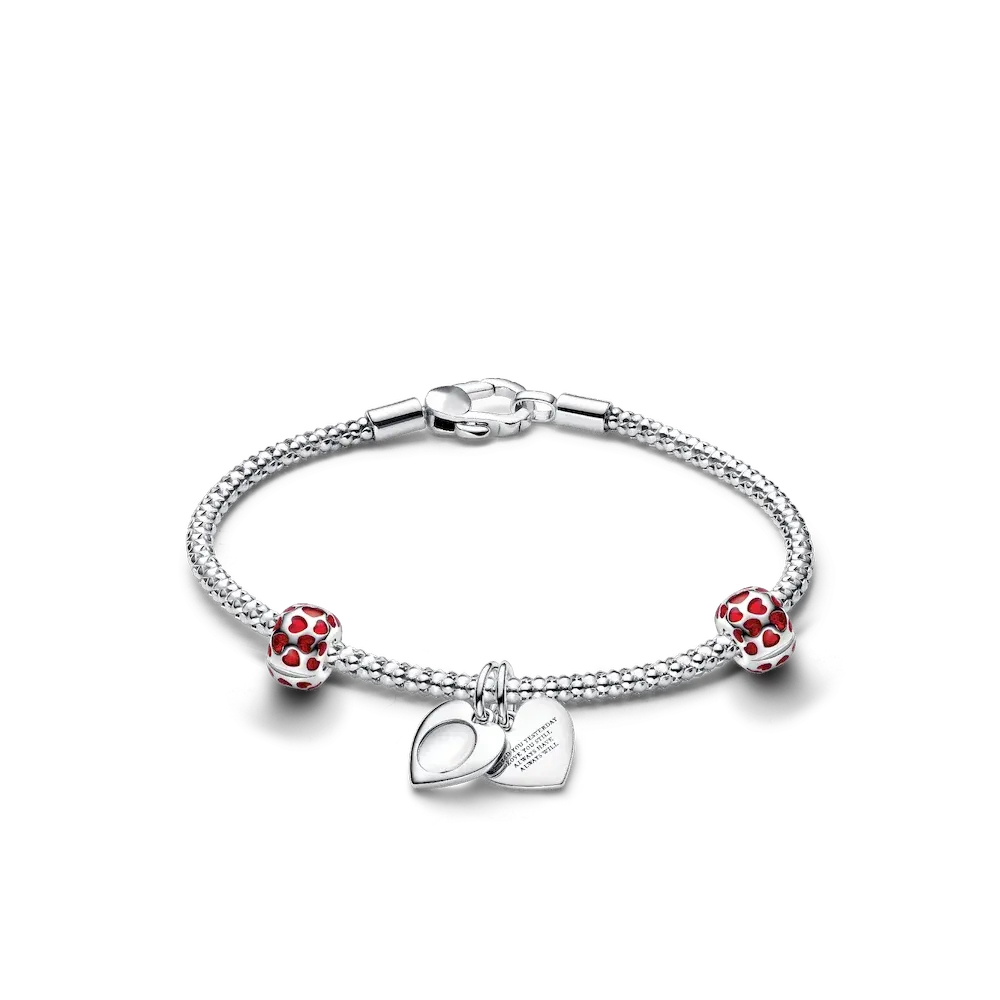 Capture meaningful moments with the Engravable Double Heart Charm Bracelet Set, a thoughtful combination of style and personal expression. The Studded Chain Bracelet, with its textured design and secure carabiner-style clasp, provides the perfect foundation for your charms. Two Hearts Round Clip Charms, crafted in sterling silver with glossy red enamel hearts, clip onto the bracelet for added security and style. The set is completed with the Engravable Double Heart Charm, featuring a functional magnifying glass engraved with loving messages and space for a personal touch. A timeless keepsake to celebrate love and special moments.