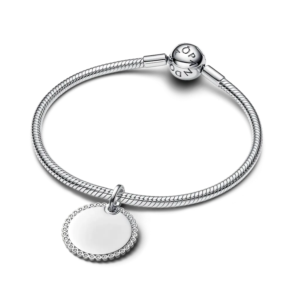 Minimalist style that makes a statement. Add our sterling silver engravable disc pendant, encircled in a halo of sparkling stones, to your collection.