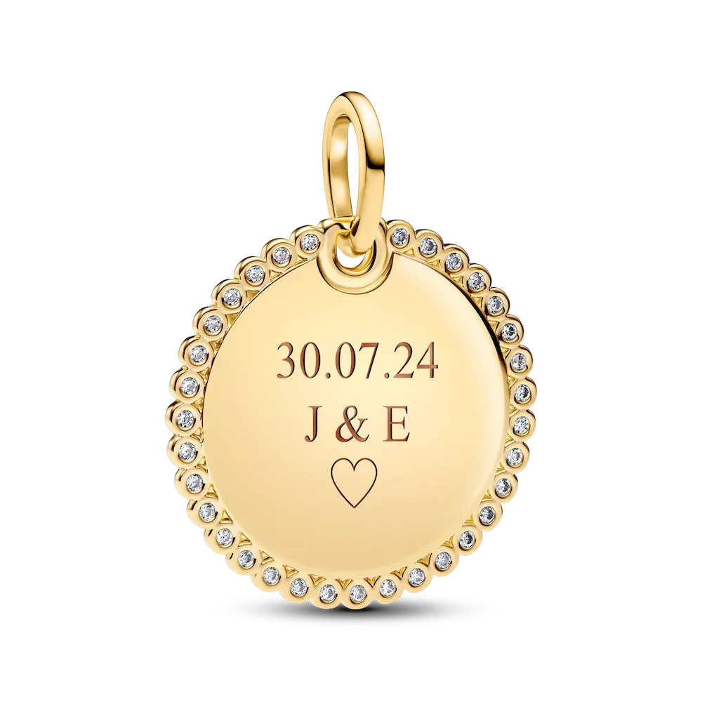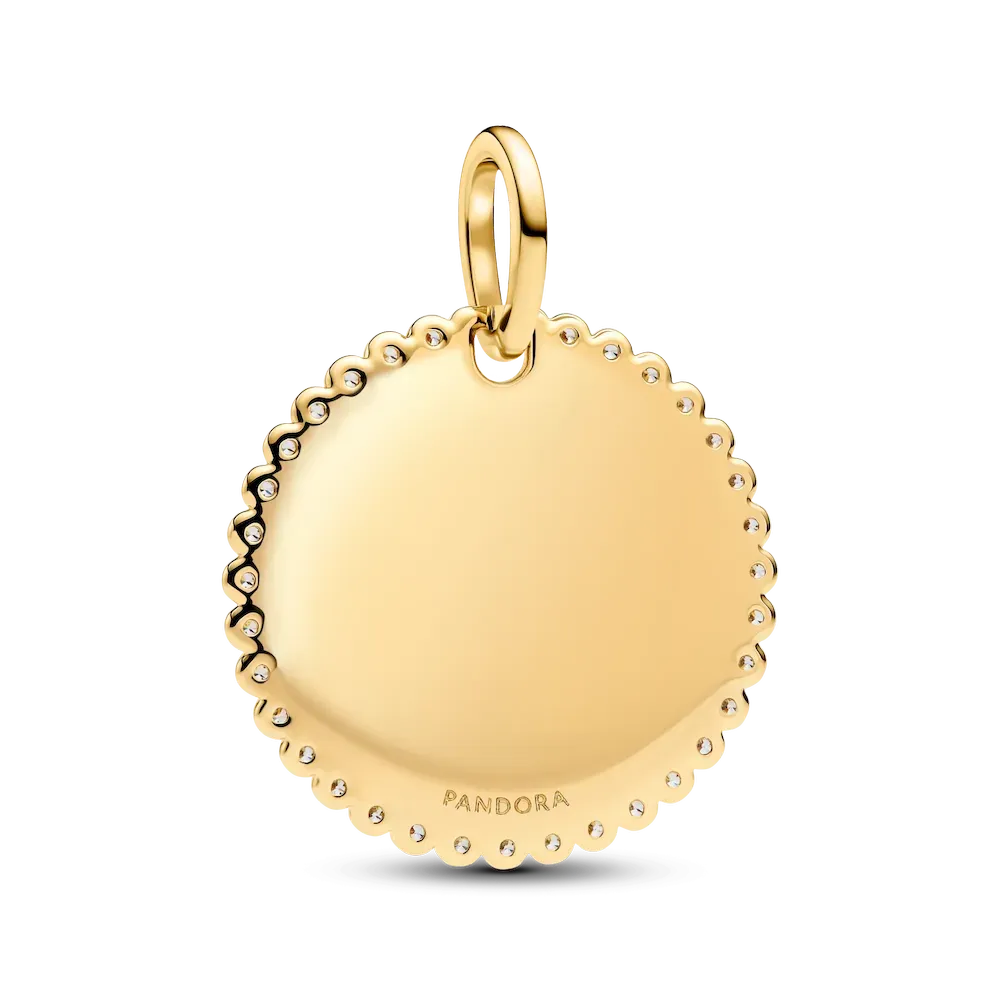 Minimalist style that makes a statement. Add our 14k gold-plated engravable disc pendant, encircled in a halo of sparkling stones, to your collection.