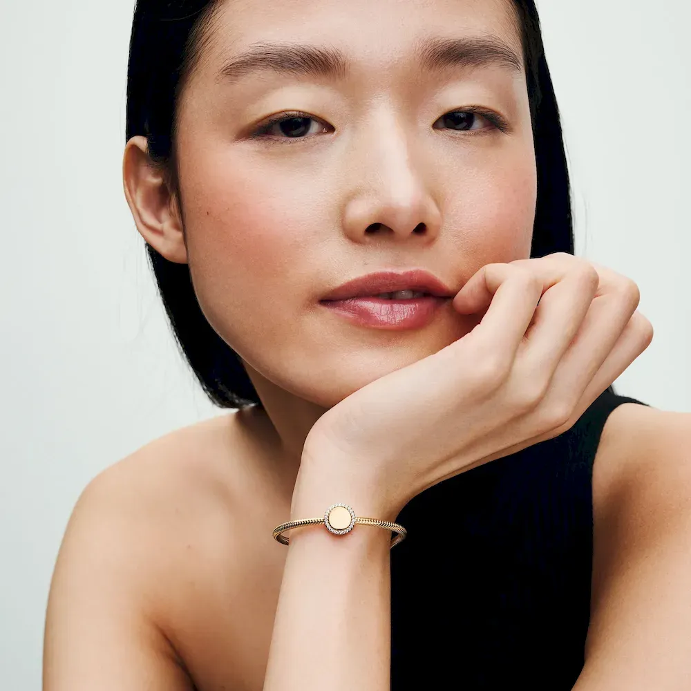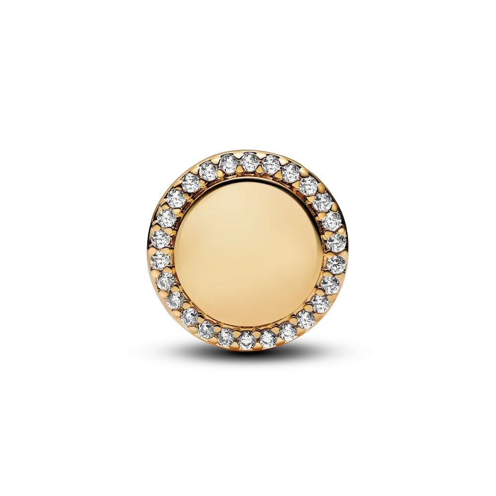 Make your mark with our engravable 14k gold-plated button charm. Surrounded by sparkling pavé and outlined with cut-out hearts, this circular charm can be personalized with an engraving on both sides. It’s the perfect meaningful gift for everyone on your list – including yourself.