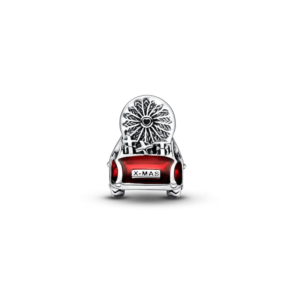 This Festive Car & Christmas Tree Charm captures the excitement of decorating our homes for the holidays and the anticipation of celebrating together. The sterling silver charm depicts a car with a Christmas tree tied to the roof and tiny 3D gifts all wrapped up in the back. The number plate reads