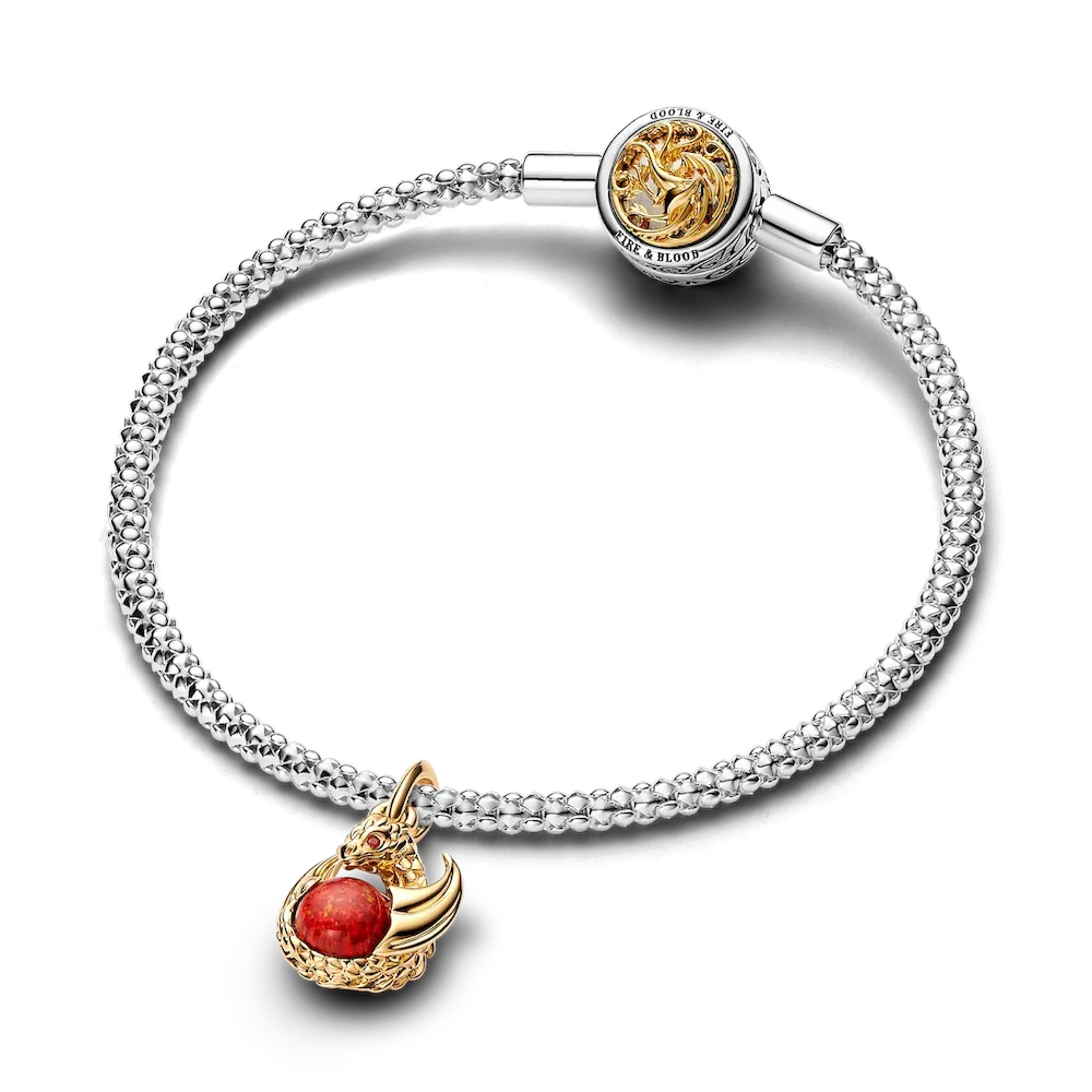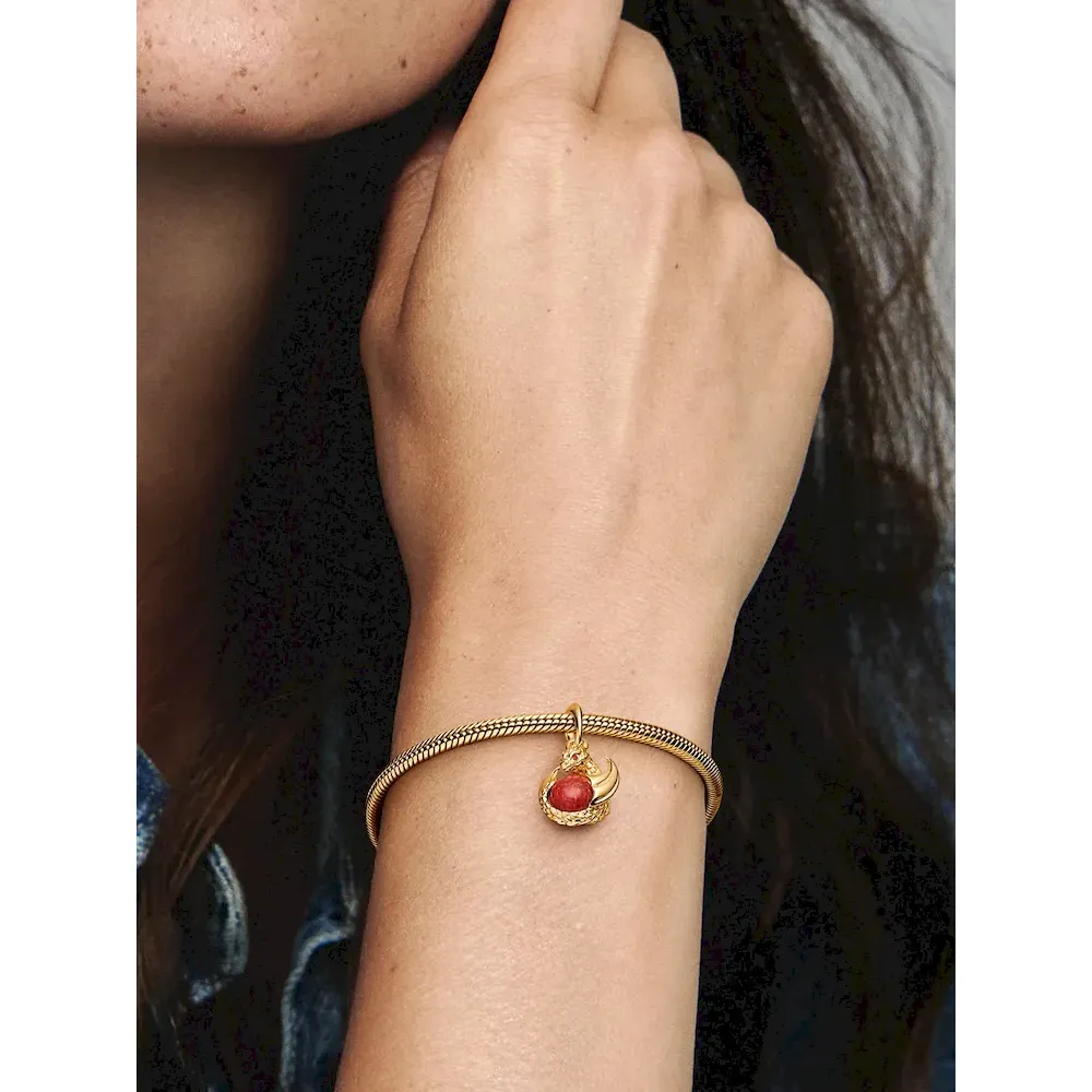 Collect your way through Westeros with the Game of Thrones Dragon Fire Dangle Charm. Here, a Game of Thrones dragon in 14k gold-plated metal wraps its body around a red lab-created opal. Intricately detailed, the dragon has two red lab-created crystals for eyes and textured lines that imitate scales and wings. In the world of Game of Thrones, dragons possess great power, as do the humans who ride them. Carry this dragon charm as a token of your own power.