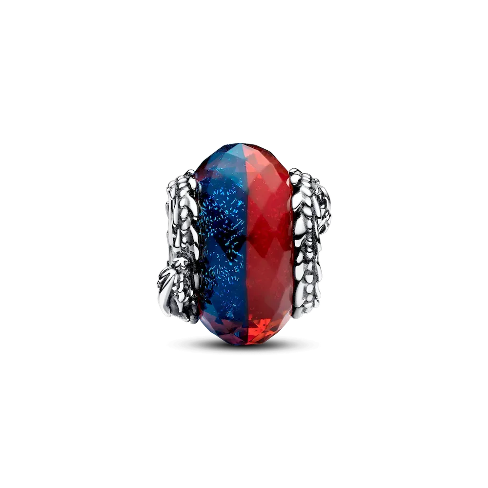 Represent your kingdom when you wear the Game of Thrones Ice & Fire Dragons Dual Murano Glass Charm. Made of red and blue Murano glass that meets seamlessly in the middle, this dragon charm has a sterling silver core that depicts dragons with heads, scaled bodies and tails. For the Game of Thrones fans who want to wear their fandom with subtle sophistication, this Murano glass charm is a must.
