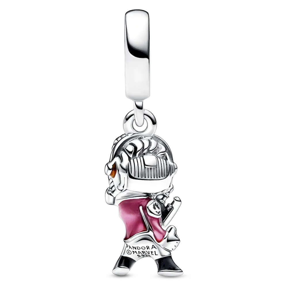 Crafted in sterling silver, Star-Lord is detailed with hand-applied enamel to accentuate his headphones, jacket and boots. Here to save the day, he holds his Quad Blaster and Walkman and wears his iconic helmet set with glowing red stones in the eyes.