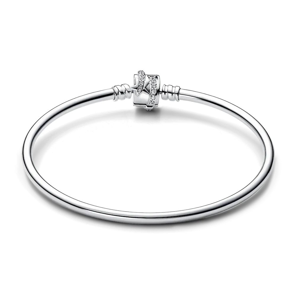 Bring celestial energy to your everyday style with the Pandora Moments Sparkling Shooting Star Clasp Bangle. Featuring a barrel clasp with a pavé-covered shooting star swirling around it, this sleek sterling silver bangle is ready for you to make it your own. Style this Pandora shooting star bracelet with a selection of your favorite charms and wear it to symbolise bringing good luck, hope and serendipity into your life.