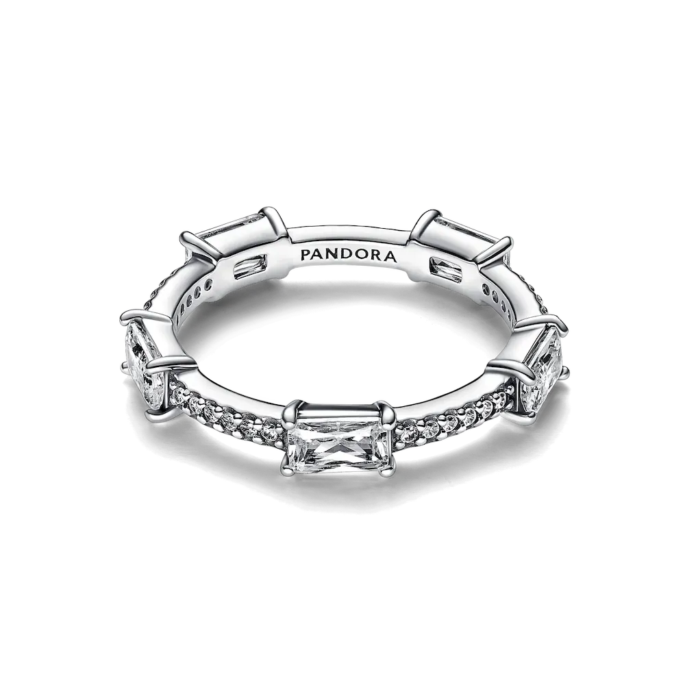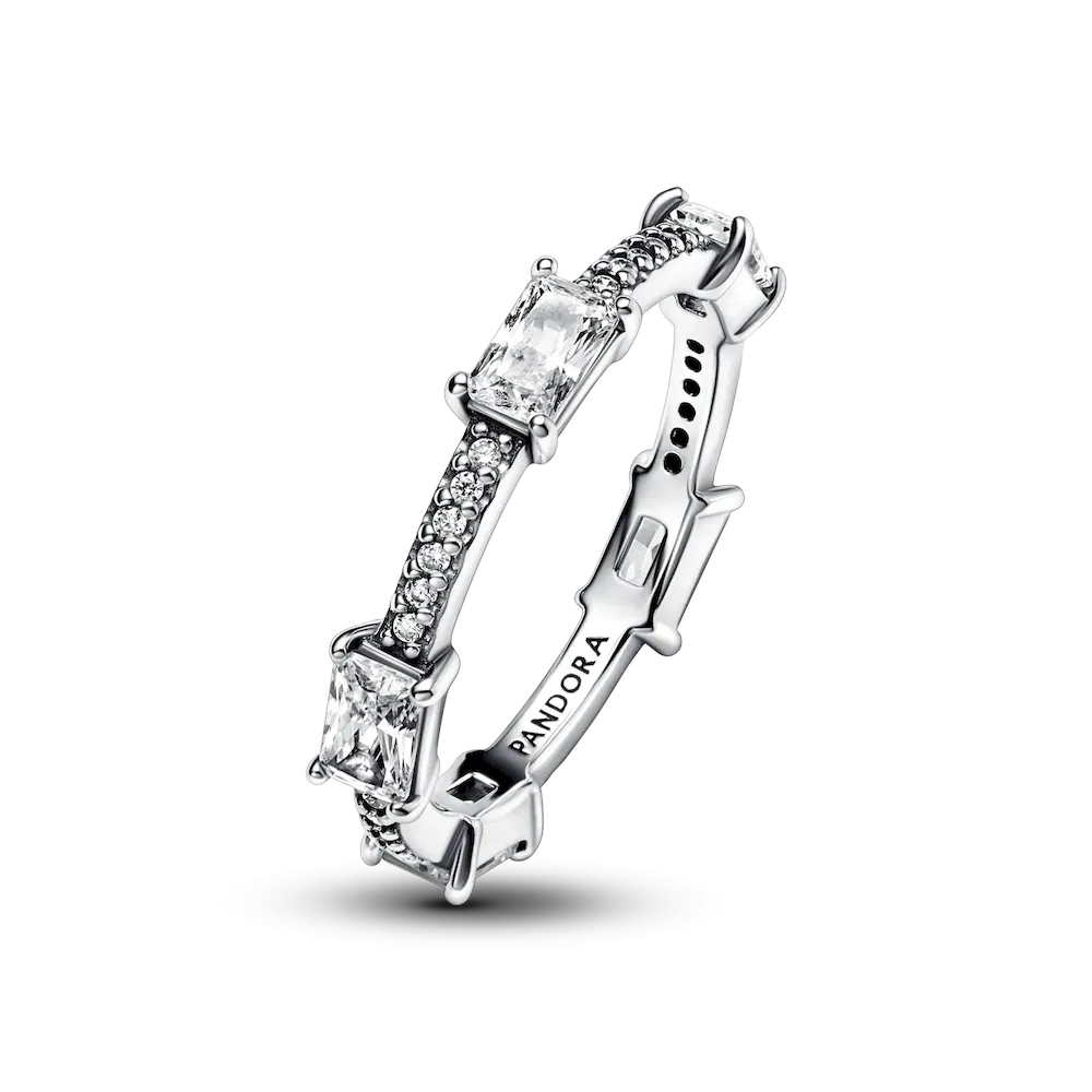 Sophisticated and elegant, this Rectangular Bars Sparkling Pavé Ring shines with an elegance that never goes out of style. Crafted from sterling silver, the band features a row of sparkling clear cubic zirconia pavé highlighted by five larger singular stones set at even intervals along the band. Inspired by classic tennis bracelets, this Pandora Timeless ring stacks beautifully and will effortlessly complement any look.