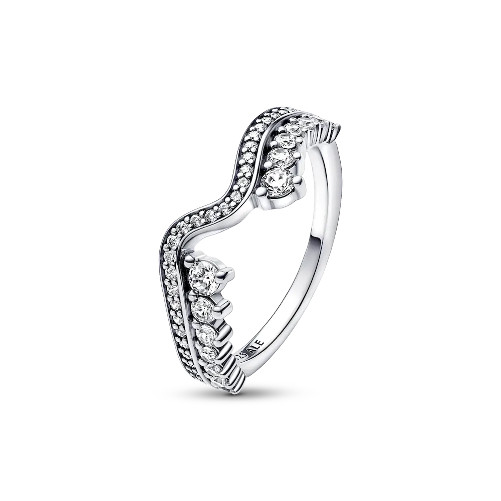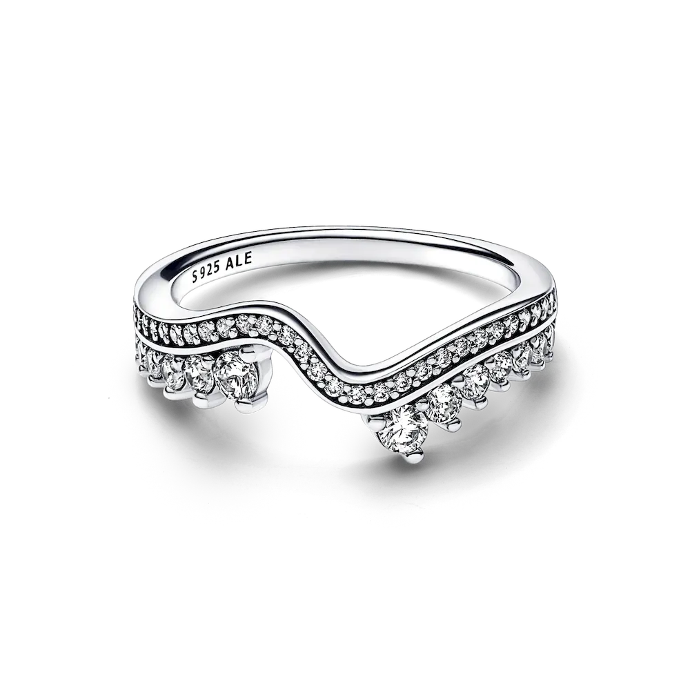 Hand-finished in sterling silver, our Sparkling Asymmetric Wave Ring features a wave-inspired pavé band accented with a split row of prong-set stones along one side. Descending in size, the stones create a ripple effect that looks elegant on its own or stacked with another Sparkling Wave Ring.