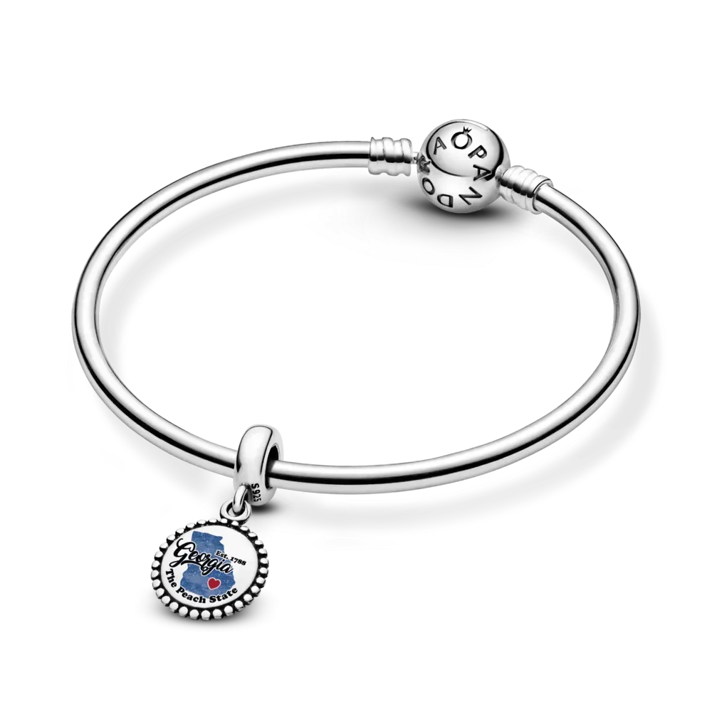 If Georgia is a place near and dear to your heart, this sterling silver dangle charm is perfect for showing off that Southern charm—as a gift to yourself or someone special. The design features a state-shaped silhouette in glossy blue enamel with “Georgia” beautifully scripted in black, and a small red heart underneath.