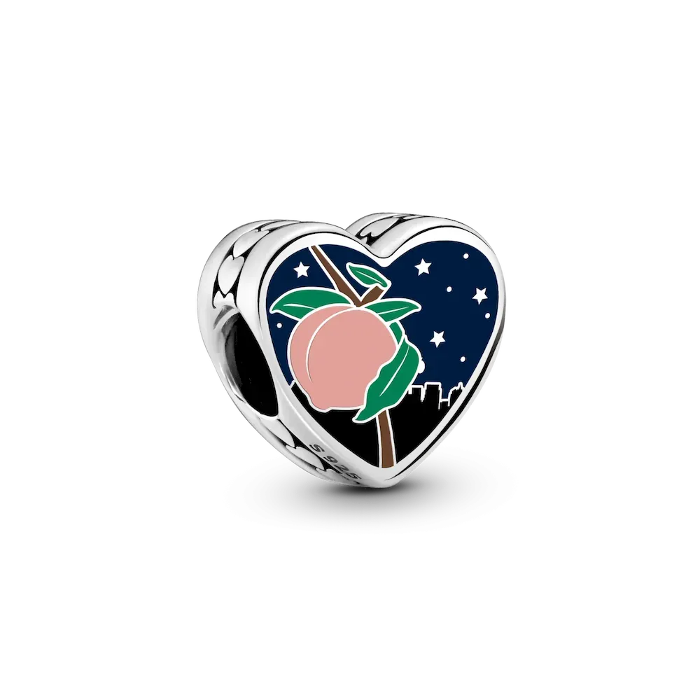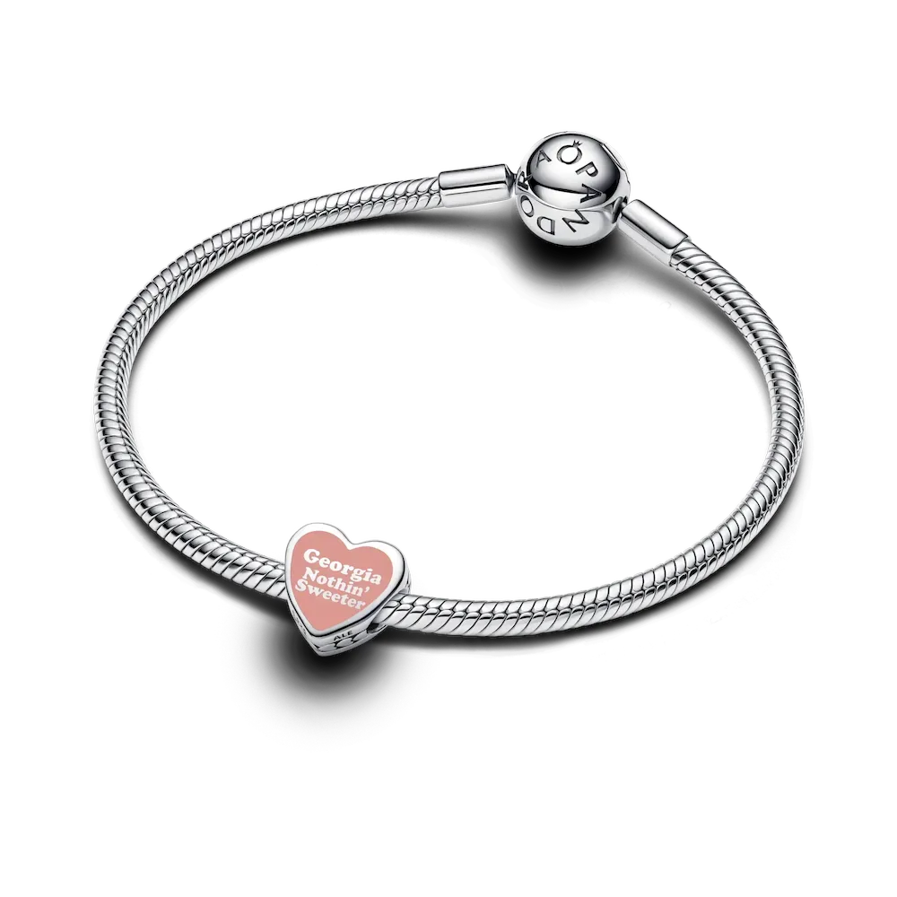 Show your love for the Peach State with the Georgia Nothin’ Sweeter Charm. This heart-shaped charm is beautifully detailed with a row of hearts around the edge, adding a soft, romantic touch. One side features a Georgia peach hanging from a branch, with the stunning Georgia night skyline in the background, evoking southern charm. On the other side, a peach-pink heart with