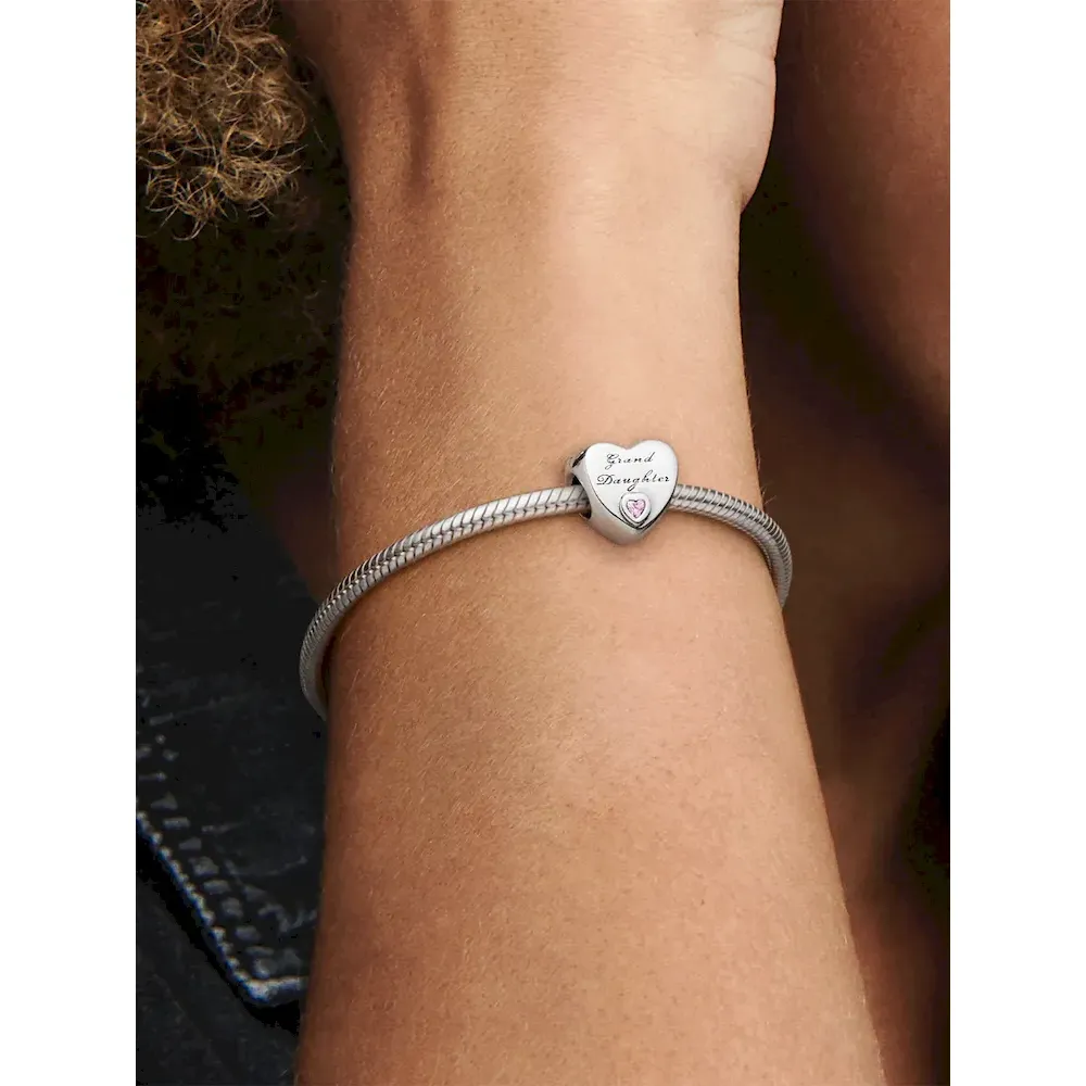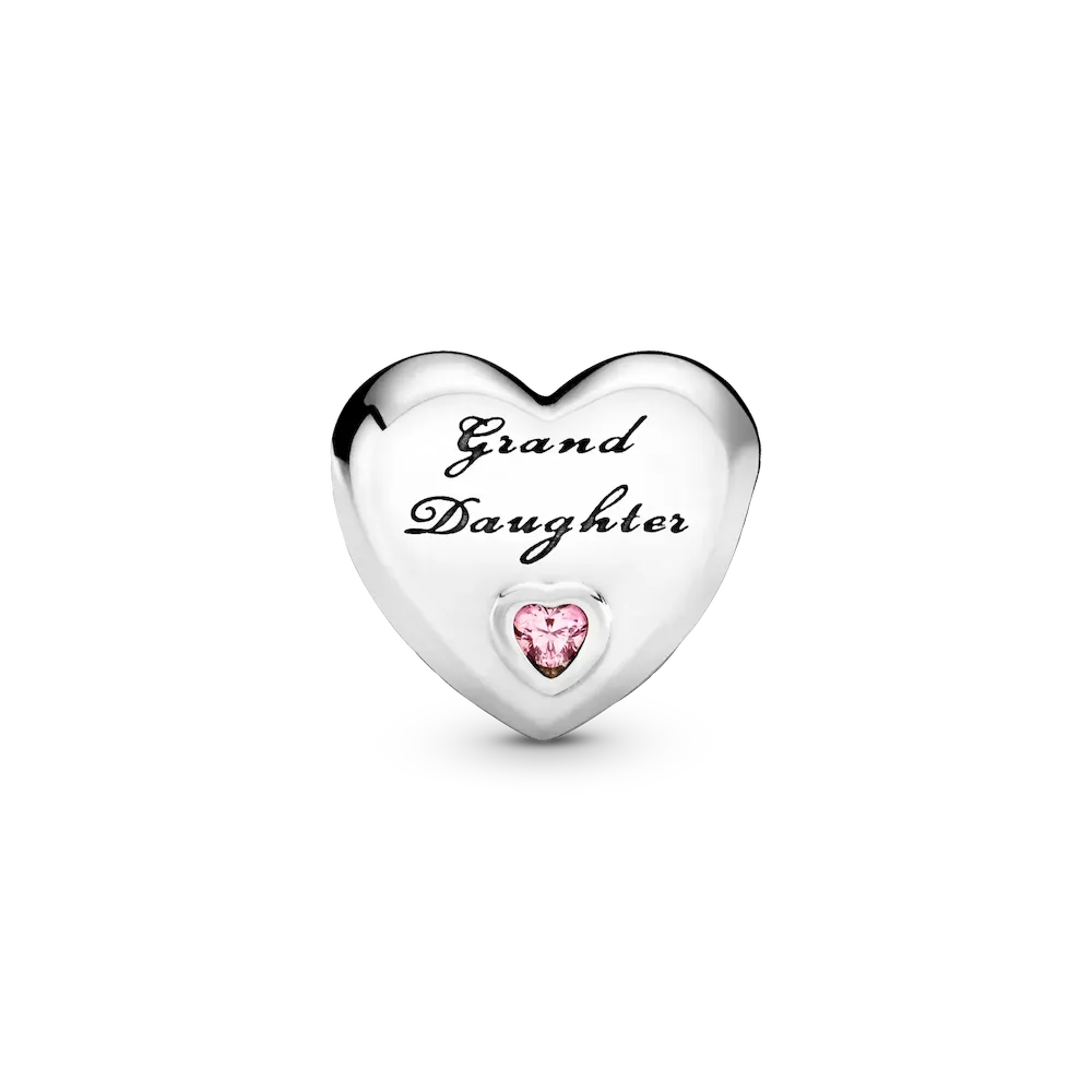 Celebrate the bond between grandparents and granddaughters with this sterling silver family charm, shaped as a heart. Polished to a high shine, the simple yet meaningful style is trimmed with heart-shaped pink stones and the engraving