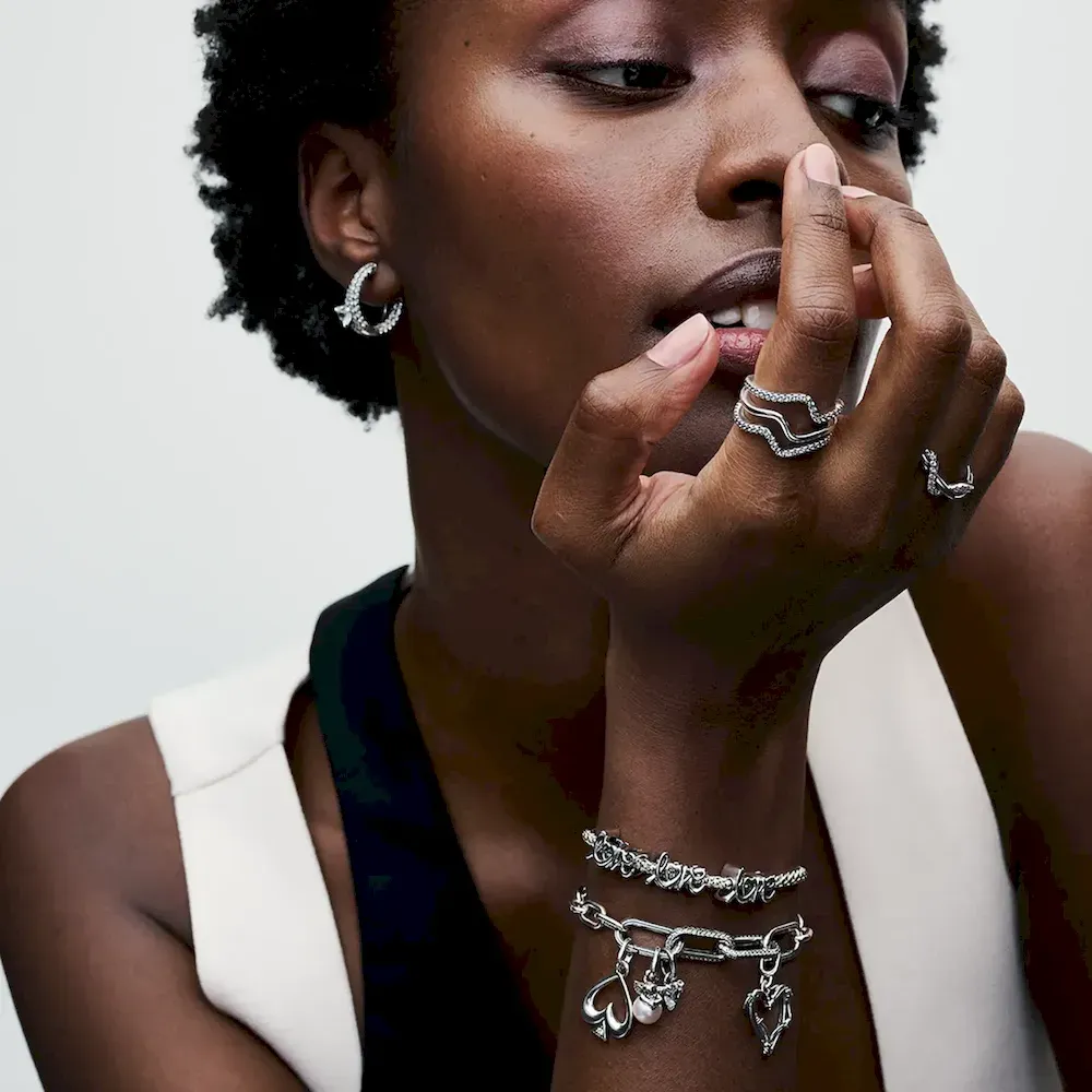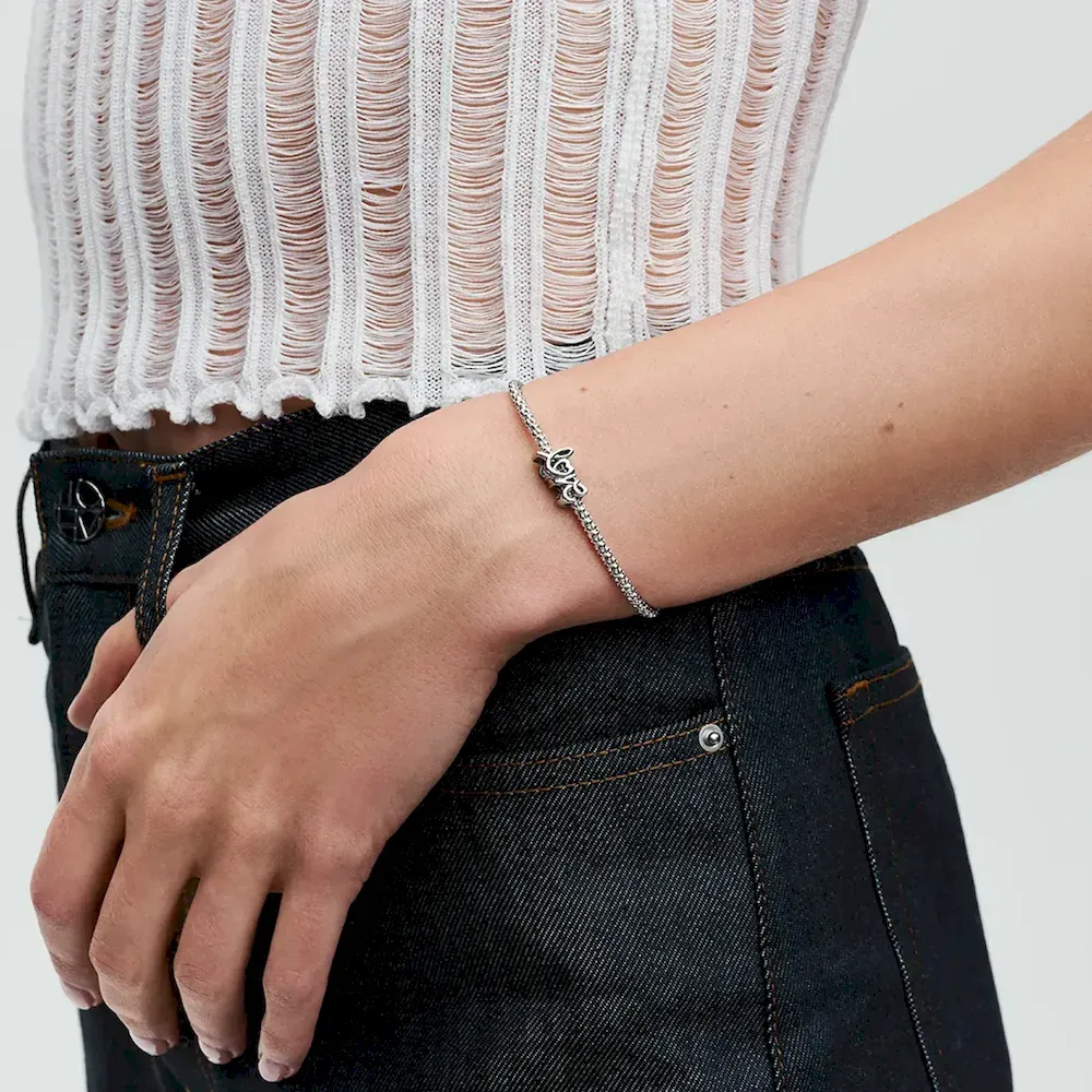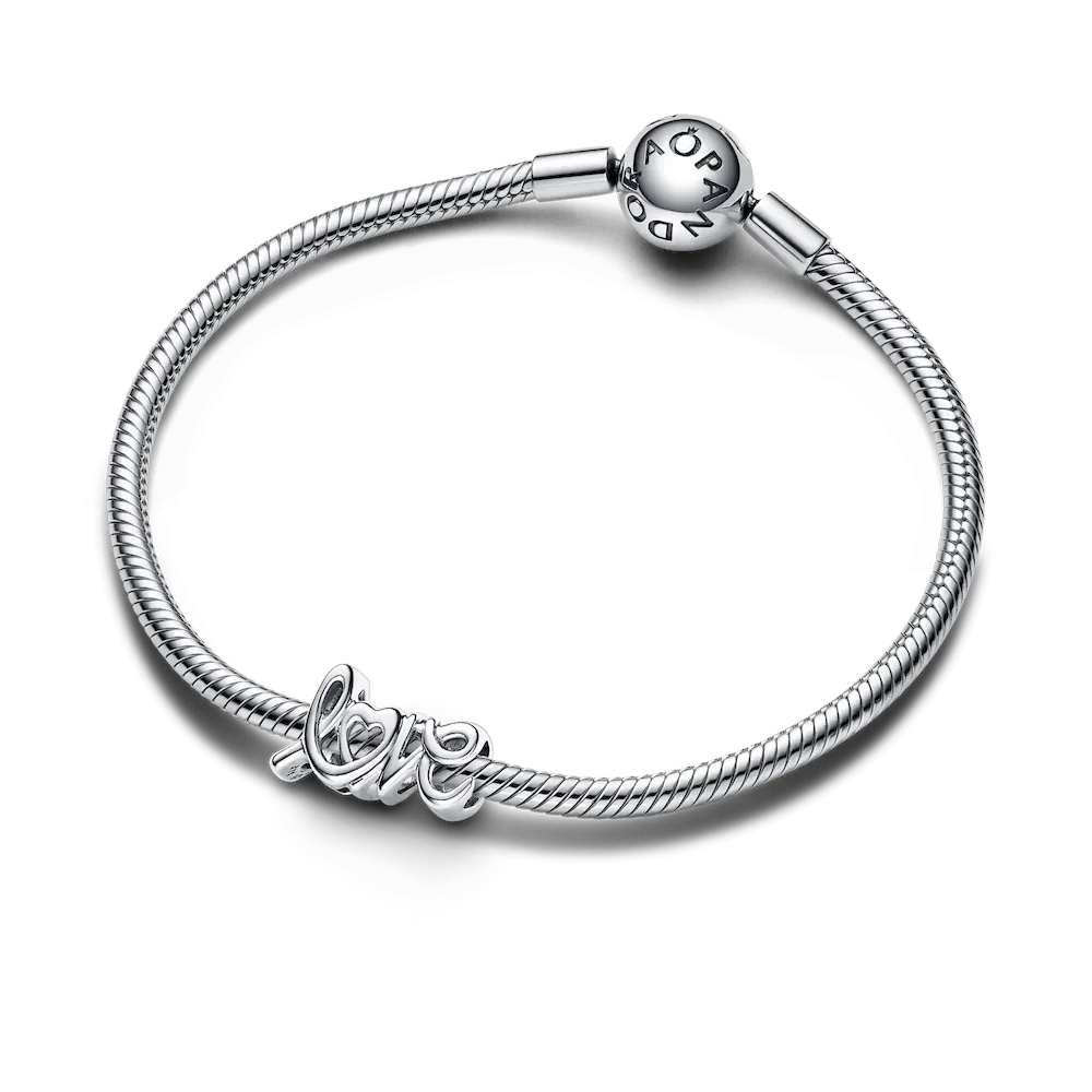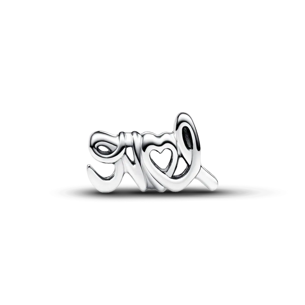 Spell out what’s in your heart with the Handwritten Love Charm. This openwork sterling silver charm is shaped like the word “love” in a handwritten style, designed to follow the line of your bracelet or charm holder. The word is mirrored on the other side of the charm, and the letter