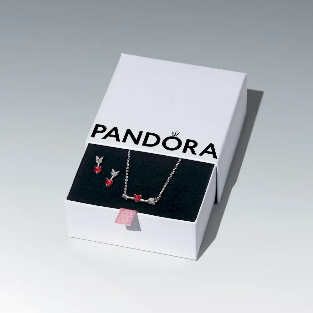 Give the gift of love at first sight. This pre-styled set includes a necklace and pair of stud earrings with arrow motifs, inspired by Cupid himself. Each piece features glittering pavé and a red Murano glass heart, evoking the passion and irresistibility of love’s desires. Be a romantic. Be love.