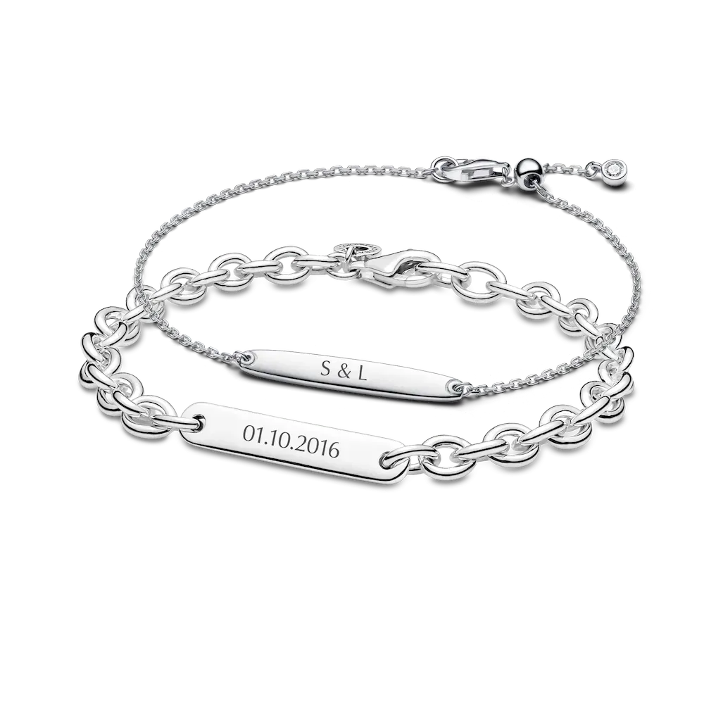 Tell your story together with this engravable duo. Crafted in sterling silver, each bracelet features an adjustable chain and a double-sided customizable bar. A set made to be shared.