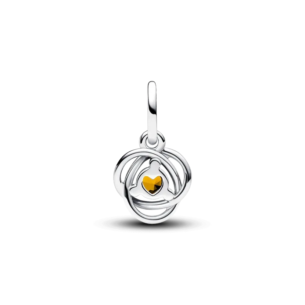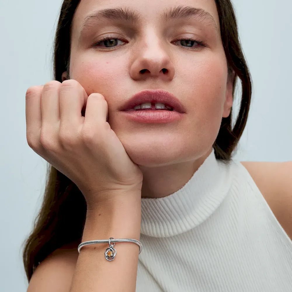 This intricate Honey Eternity Circle Dangle Charm is a must-have infinity charm for your Pandora Moments collection. Crafted in lustrous sterling silver, it features an openwork infinity braid decorated with a central honey-colored man-made crystal, elegantly surrounded by three clear cubic zirconia. The intricate design symbolizes eternity and adds an additional layer of meaning to the piece. Elevate your bracelet with this essential piece or gift it as a representation of an everlasting bond.