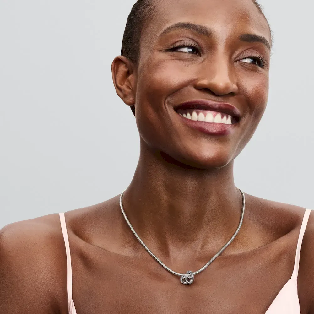The Infinity Heart Necklace Set blends elegance and boldness. Featuring a studded sterling silver chain with a carabiner clasp and a pavé-covered infinity knot heart charm, it’s a meaningful addition to any collection.