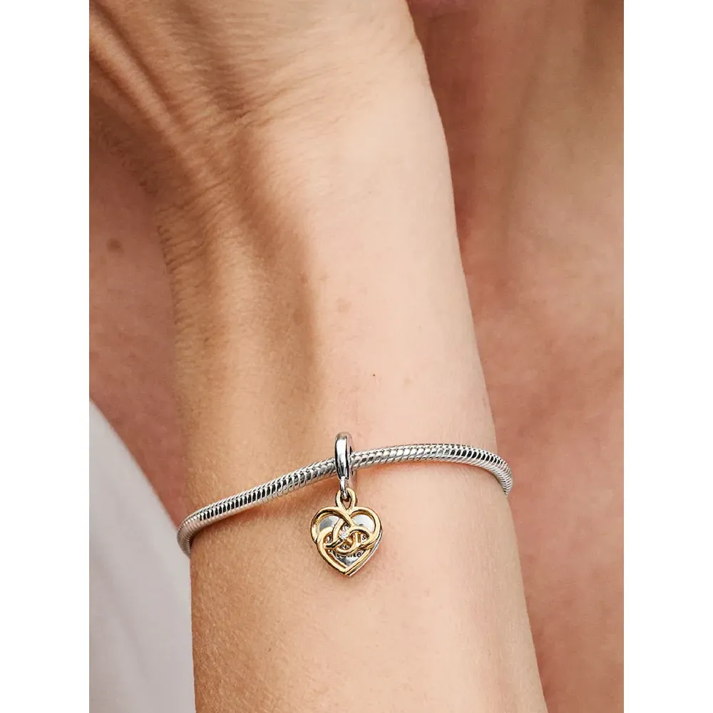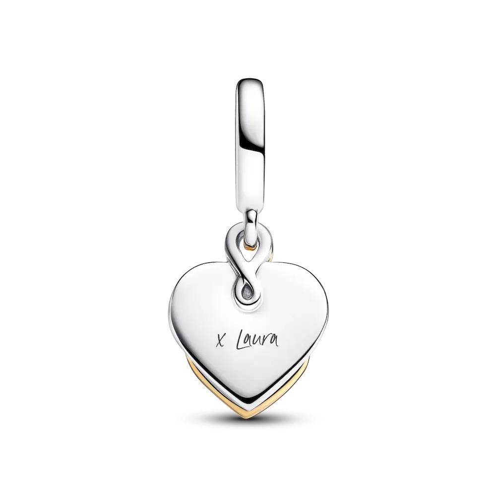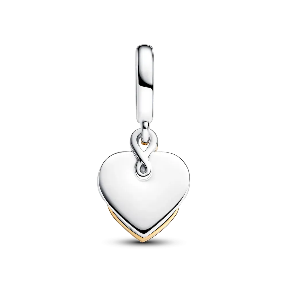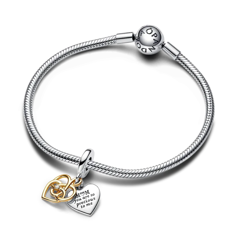 The power of motherly love shines bright in our Lab-grown Diamond Engravable Mom Double Dangle Charm. Featuring a 14k gold-plated heart motif on a heart-shaped disc intertwined with a knot-inspired openwork heart, it embodies the infinite love for Mom. A 0.009 ct lab-grown diamond shines at the center, symbolizing her preciousness. The other disc crafted in sterling silver carries a heartfelt engraving that reads
