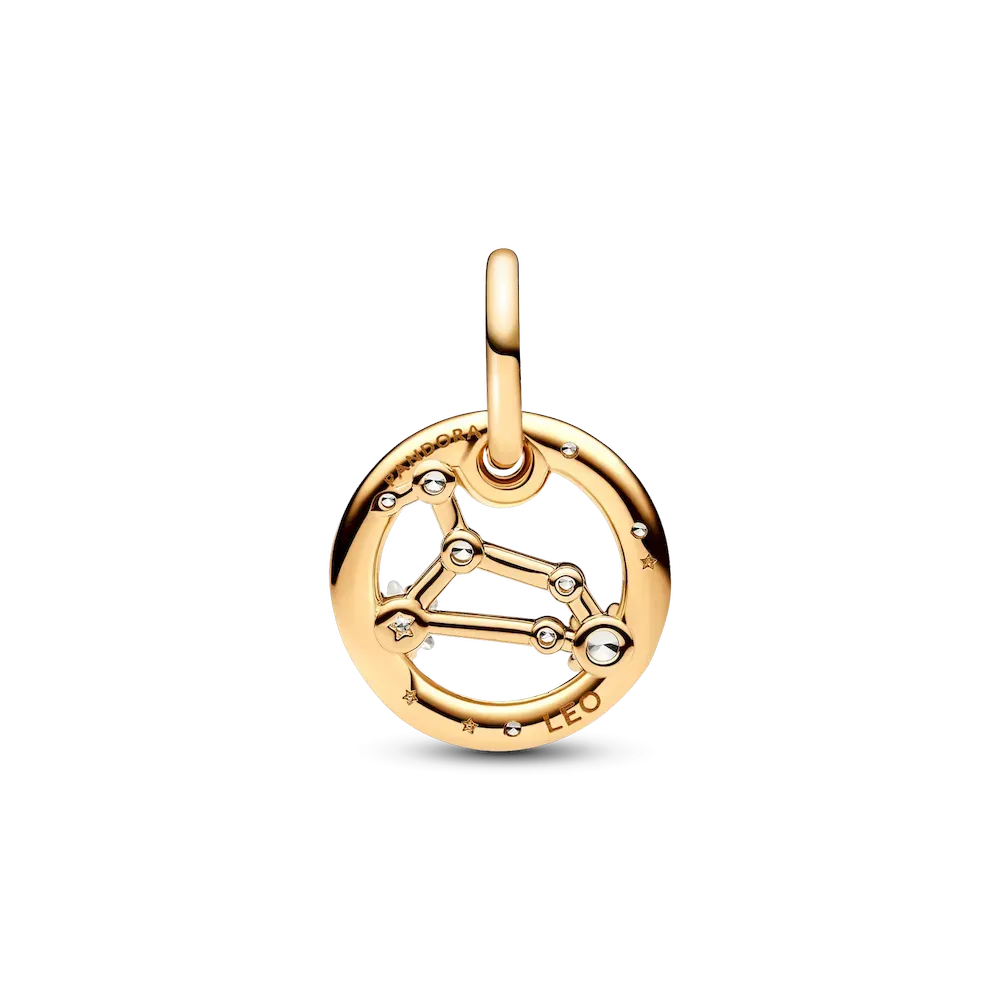 Let the stars guide your look with the Leo Zodiac Dangle Charm. This Pandora Moments dangle charm is crafted our 14k gold-plated unique metal blend, has a circular outer frame and features clear sparkling cubic zirconia as well as the shape of the Leo zodiac sign. The back side of the frame is engraved with