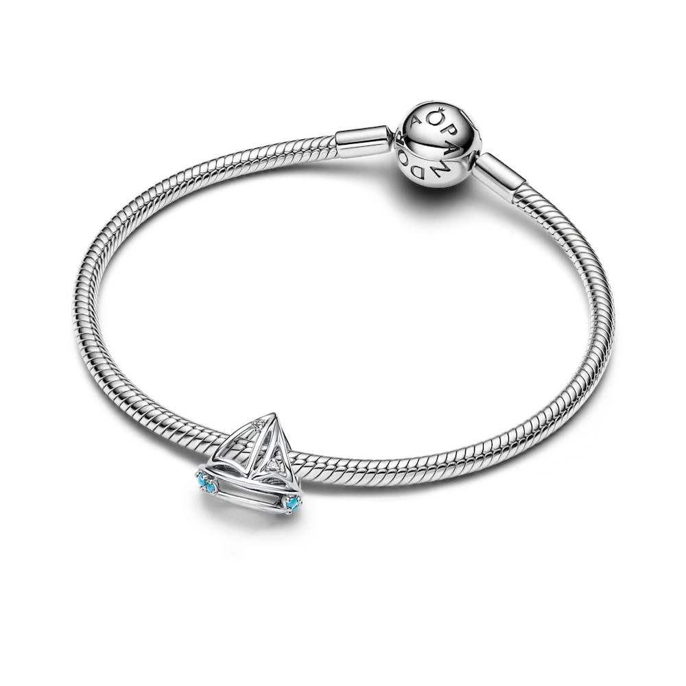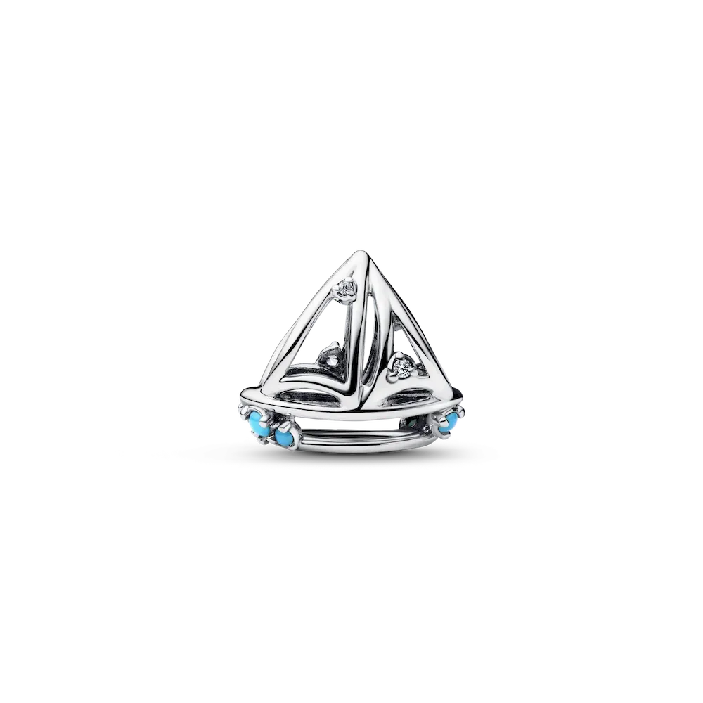 Sail away in style with a set of two charms inspired by life at sea. Includes a sterling silver openwork fish charm and sterling silver openwork sailboat charm, featuring sea-inspired blue details.