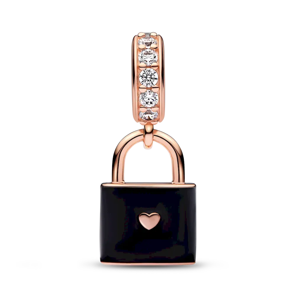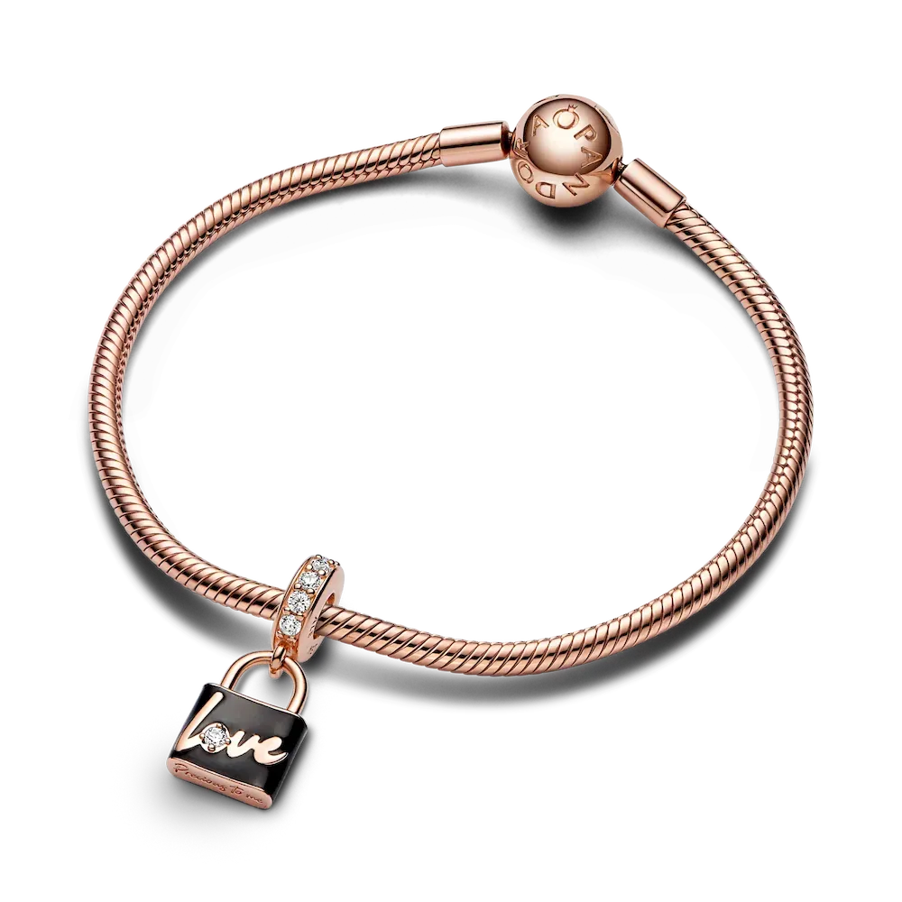 Celebrate your everlasting love with our Love Padlock Dangle Charm. This 14k rose gold-plated padlock is hand-finished with black enamel, accentuating the polished lifted script across the front and heart on the back. The script reads