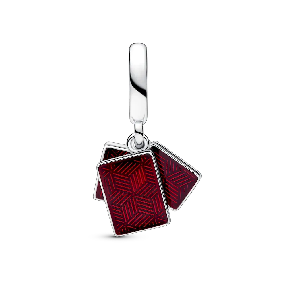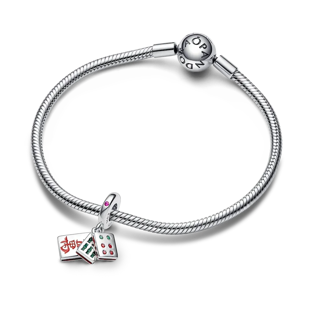 Carry the symbols of your favourite game with our Mahjong Triple Dangle Charm. In Chinese numerology, six is considered a lucky number and triple six represents a blessing for everything to go well. This sterling silver charm features three Mahjong tiles detailed with six red and green man-made crystals, six imprinted green enamel bamboo motifs and an engraved red enamel Chinese character for “six million.” Add it to your collection to always have a winning hand close by.