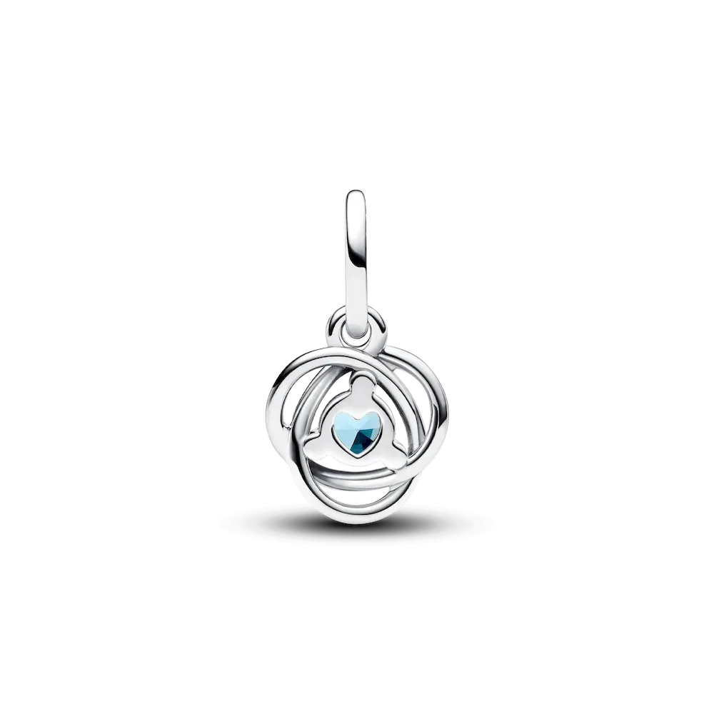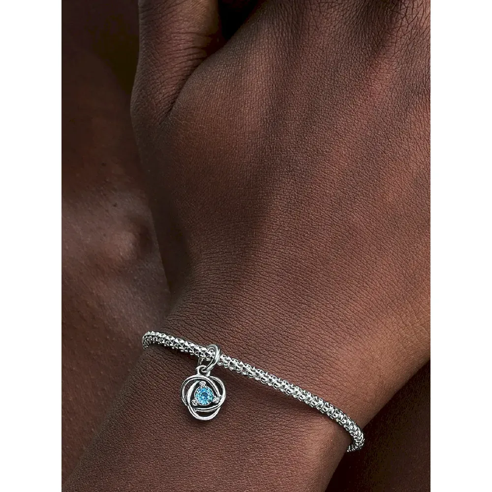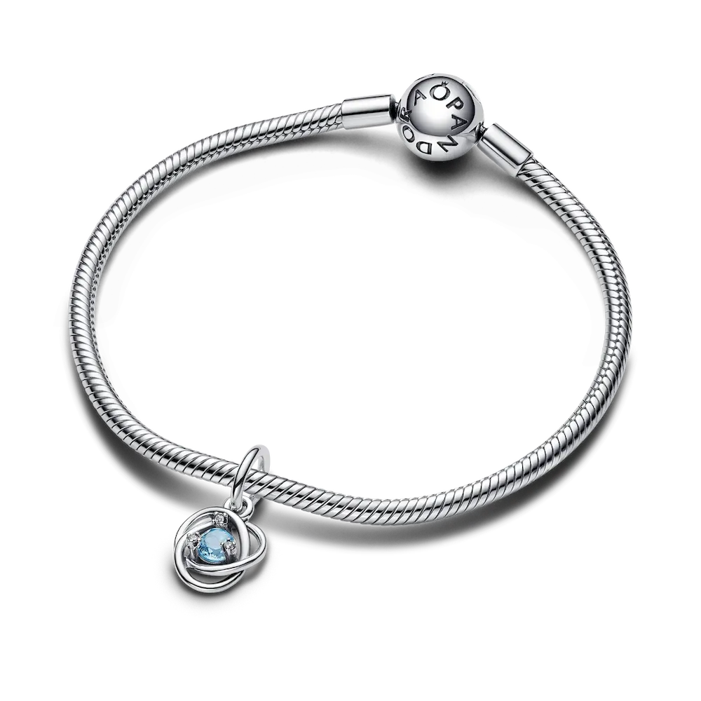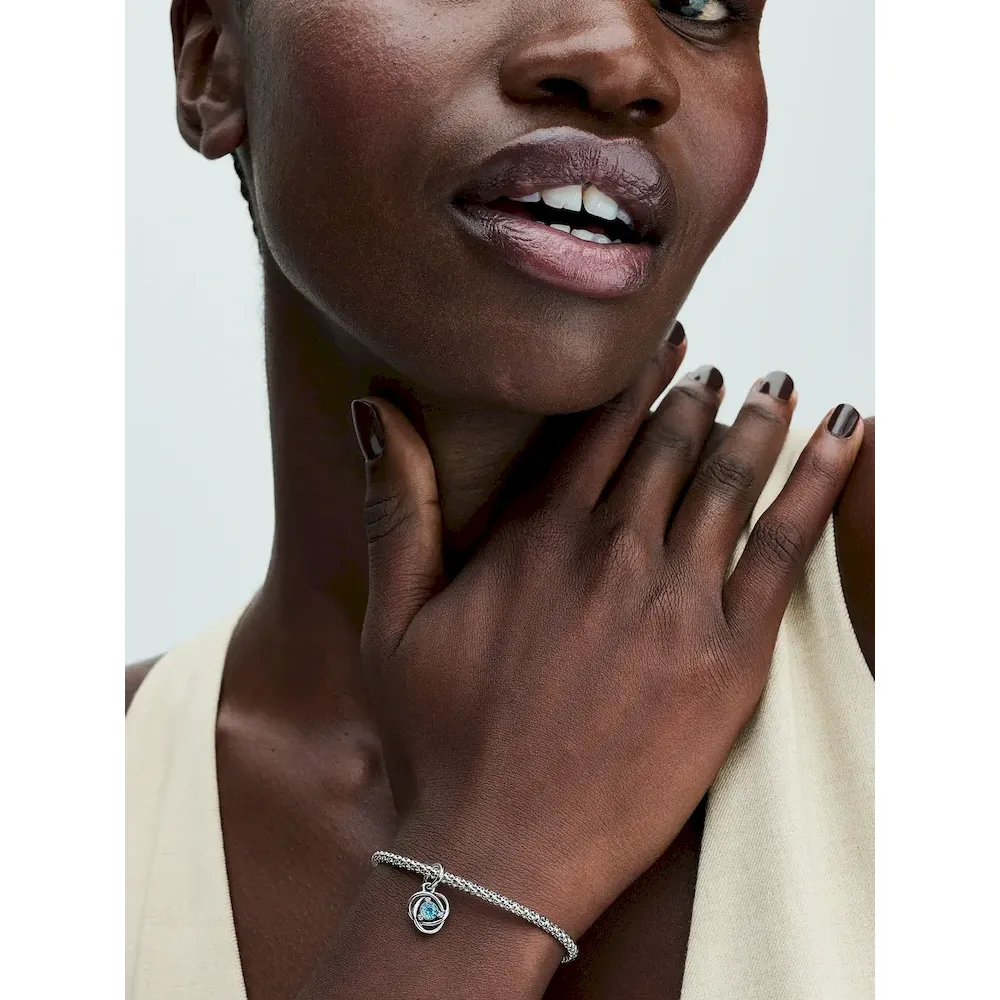 Introducing a new addition to the Eternity Circle family with our Stones of the Month dangle charms. Inspired by unconditional love and power, this intricate knot design features openwork infinity braiding around March’s beautiful sea aqua blue man-made crystal at the center. Surrounded by three small cubic zirconia stones on the front and a cut-out heart shape on the back for maximum sparkle. This dazzling dangle charm comes on a matching sterling silver Pandora Moments Snake Chain Slider Bracelet. Capture the symbolism of a March birthday, milestone or anniversary with this brilliant set. Unconditionally. Infinitely. Be love.