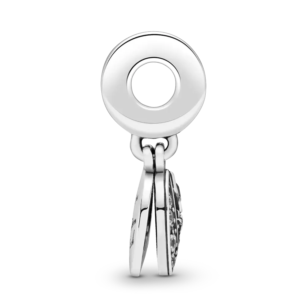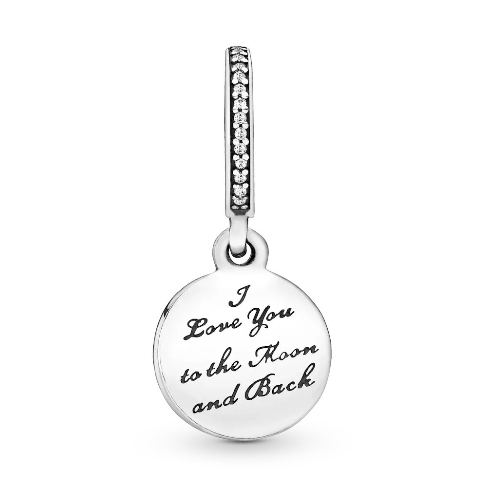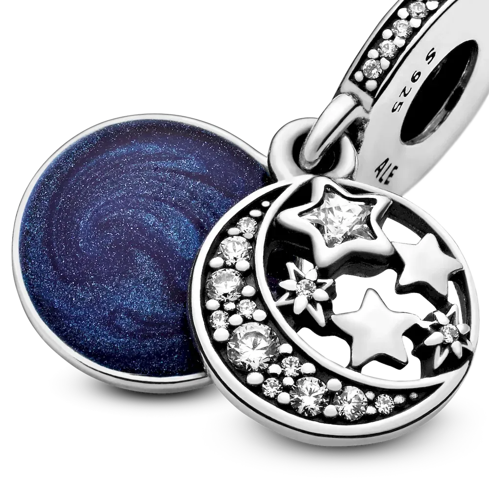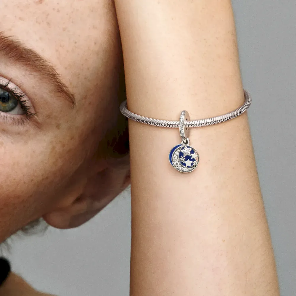Express your love in the most beautiful way possible with this magical Moon & Blue Sky Dangle charm. Crafted in sterling silver, this exquisite piece features two double-sided pendants decorated with blue enamel, shimmering cubic zirconia stones, and the engraving “I love you to moon and back.” Wear it with other blue and sterling silver charms on a snake chain bracelet or as a single pendant on a Pandora necklace chain.