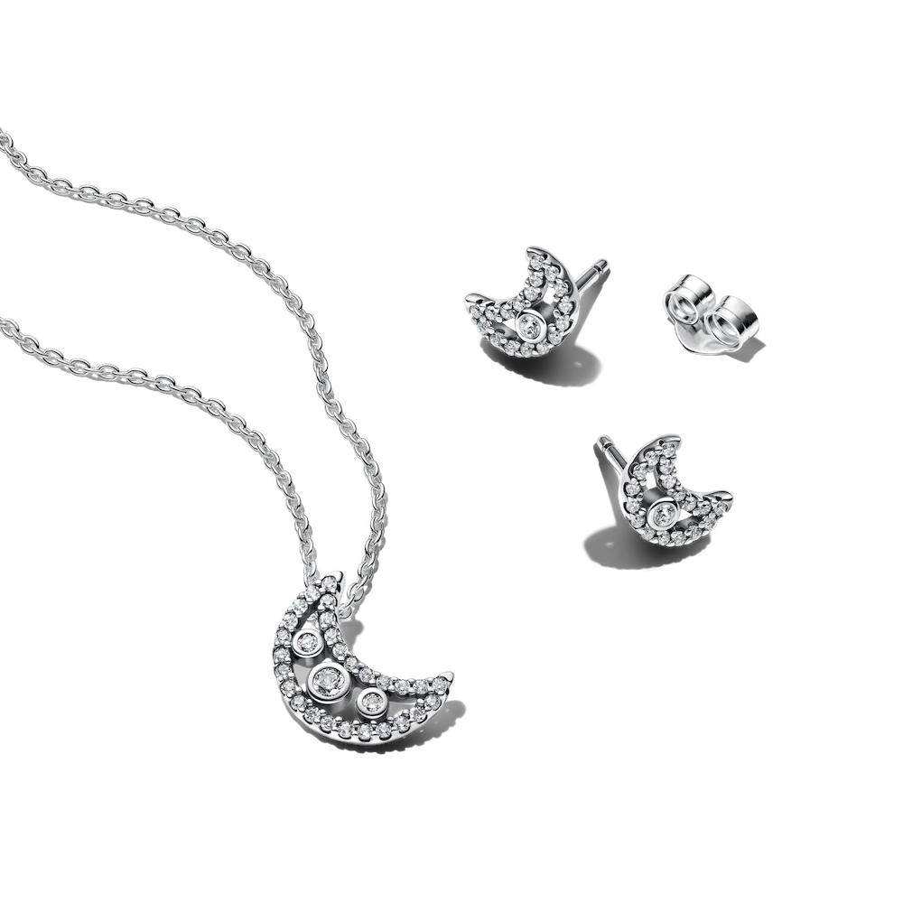Celebrate moon magic with this sterling silver necklace and earring set featuring crescent shapes and twinkling cubic zirconia. A radiant gift for someone who follows their inner light.
