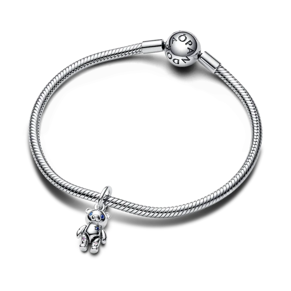 Our Movable Teddy Bear Dangle Charm is made of stardust and love. This extra-special teddy bear charm is crafted with stones set in star shapes, inspired by galaxies of shooting stars. With moveable arms and legs, this silver dangle charm serves as the perfect reminder that anything is possible. Featuring a blue man-made crystal set in a star to represent its heart, this teddy makes for an extra special addition to your most-loved charms.